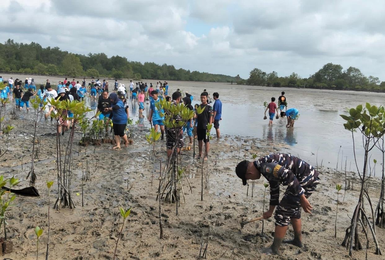 refubliknews.com, – TNI AL, Bintan,- Personel Pangkalan TNI Angkatan Laut Bintan bersama 117 Siswa Siswi SMA Tunas Bangsa Lagoi dan 17 Guru Pembimbing melaksanakan penanaman 10.000 ribu pohon mangrove dalam rangka memperingati Hari Menanam Pohon Sedunia yang dilaksanakan di Area Pantai Pelabuhan BBT Lagoi, Sabtu (28/02/2025).