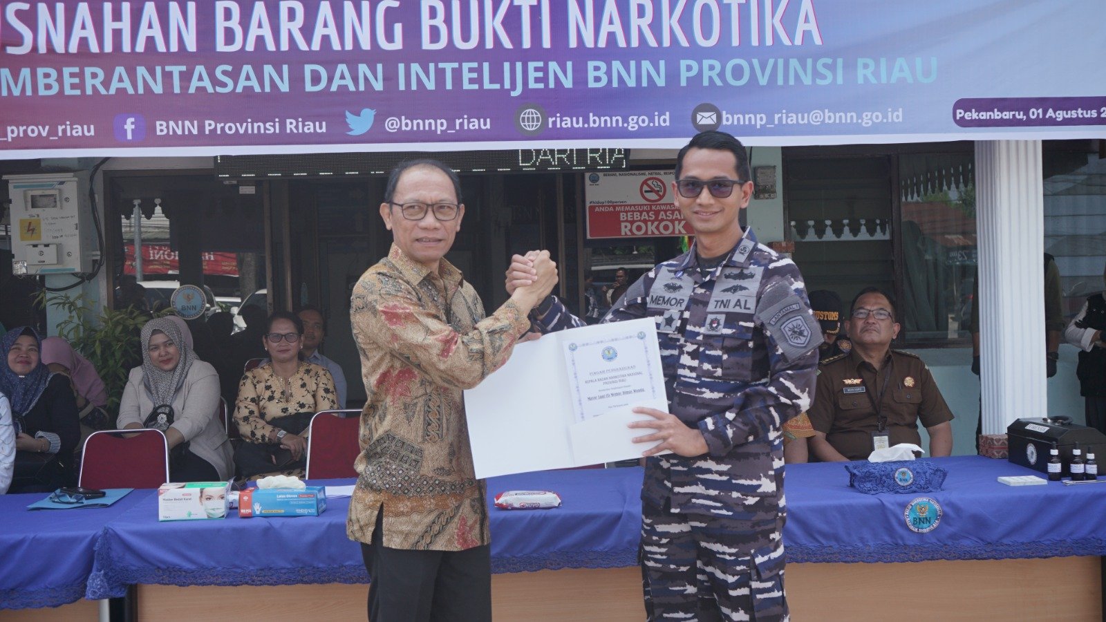 Turut hadir dalam kegiatan, Kepala BNN Provinsi Riau, Kabid Pemberantasan dan Intelijen BNNP Riau, Perwakilan Dir Resnarkoba Polda Riau, Perwakilan Kepala Bidlabfor Polda Riau, Kepala BNNK Pekanbaru, Plt. Kepala BNNK Dumai, Perwakilan Tokoh Masyarakat setempat.