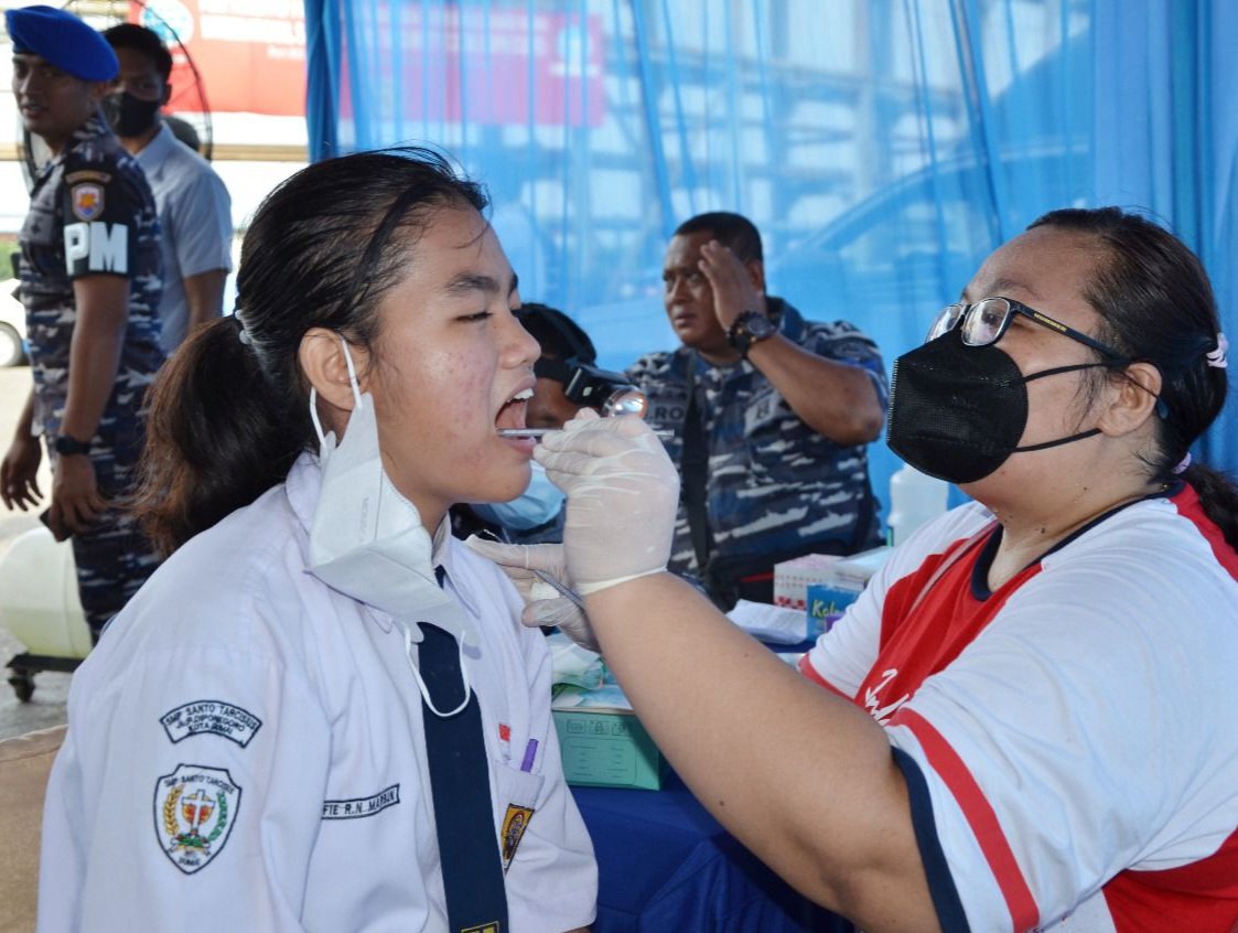 Dumai,- Komandan Lanal Dumai Kolonel Laut (P) Stanley Lekahena, M.Tr. Hanla., didampingi Ibu Ketua Jalasenastri Cabang 4 Korcab I DJA I Ny. Sandra Stanley melaksanakan Bhakti Kesehatan (Khitanan, Donor Darah diatas KRI, Pembersihan Plak dan Karang Gigi) dalam rangka HUT TNI Angkatan Laut Tahun 2022 yang dipimpin langsung oleh Kepala Staf Angkatan Laut (Kasal) Laksamana TNI Yudo Margono dari KRI Semarang-594 di Perairan Pulau Untung Jawa dan diikuti secara virtual melalui zoom meeting dari Dermaga C Pelindo Dumai, Jalan Datuk Laksamana, Kelurahan Buluh Kasap, Kecamatan Dumai Timur, Selasa (06/09/2022).