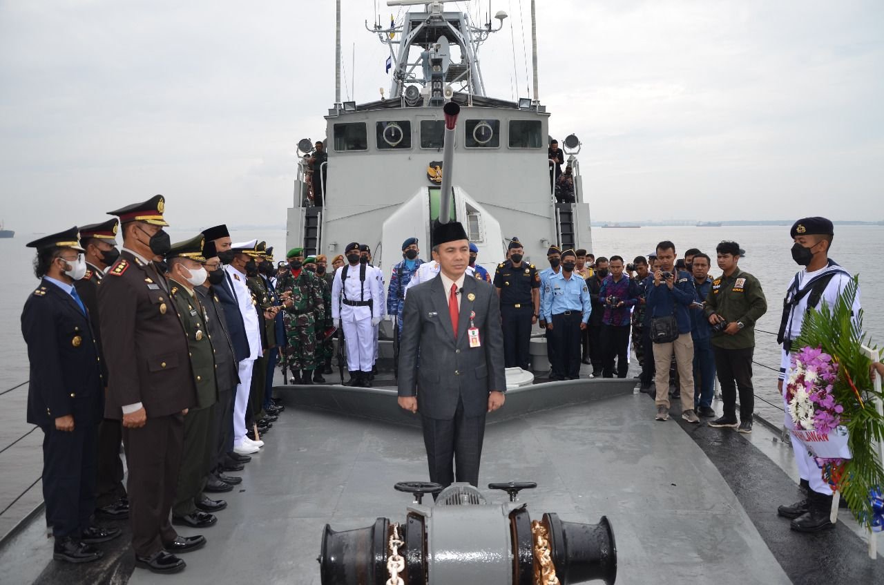 Dumai,- Komandan Lanal Dumai kolonel Laut (P) Stanley Lekahena, M.Tr. Hanla., menghadiri upacara tabur bunga dalam rangka memperingati Hari Pahlawan tahun 2022 yang dilaksanakan di Perairan Dumai menggunakan KRI Lemadang-632, Kamis (10/11/2022).
