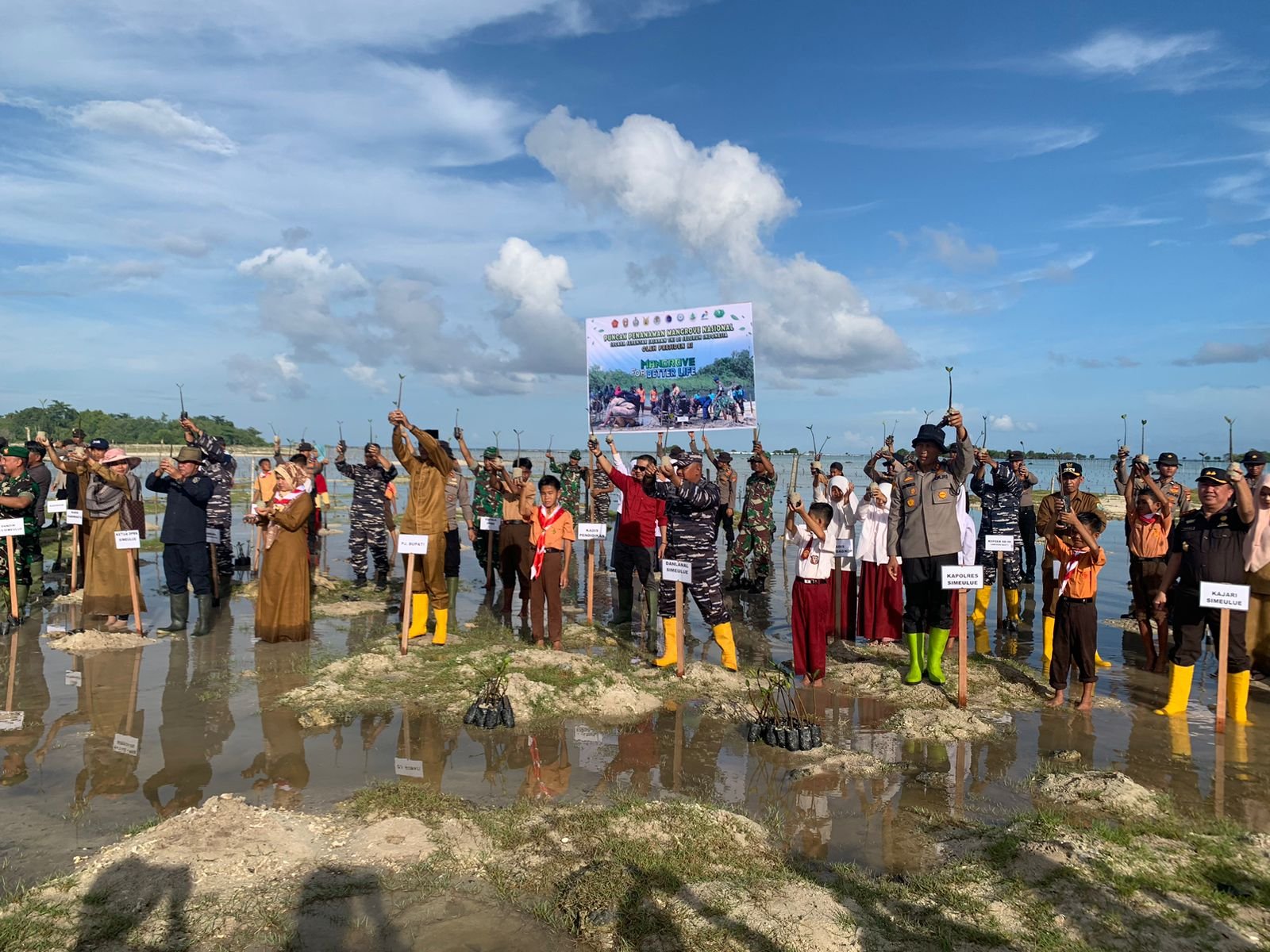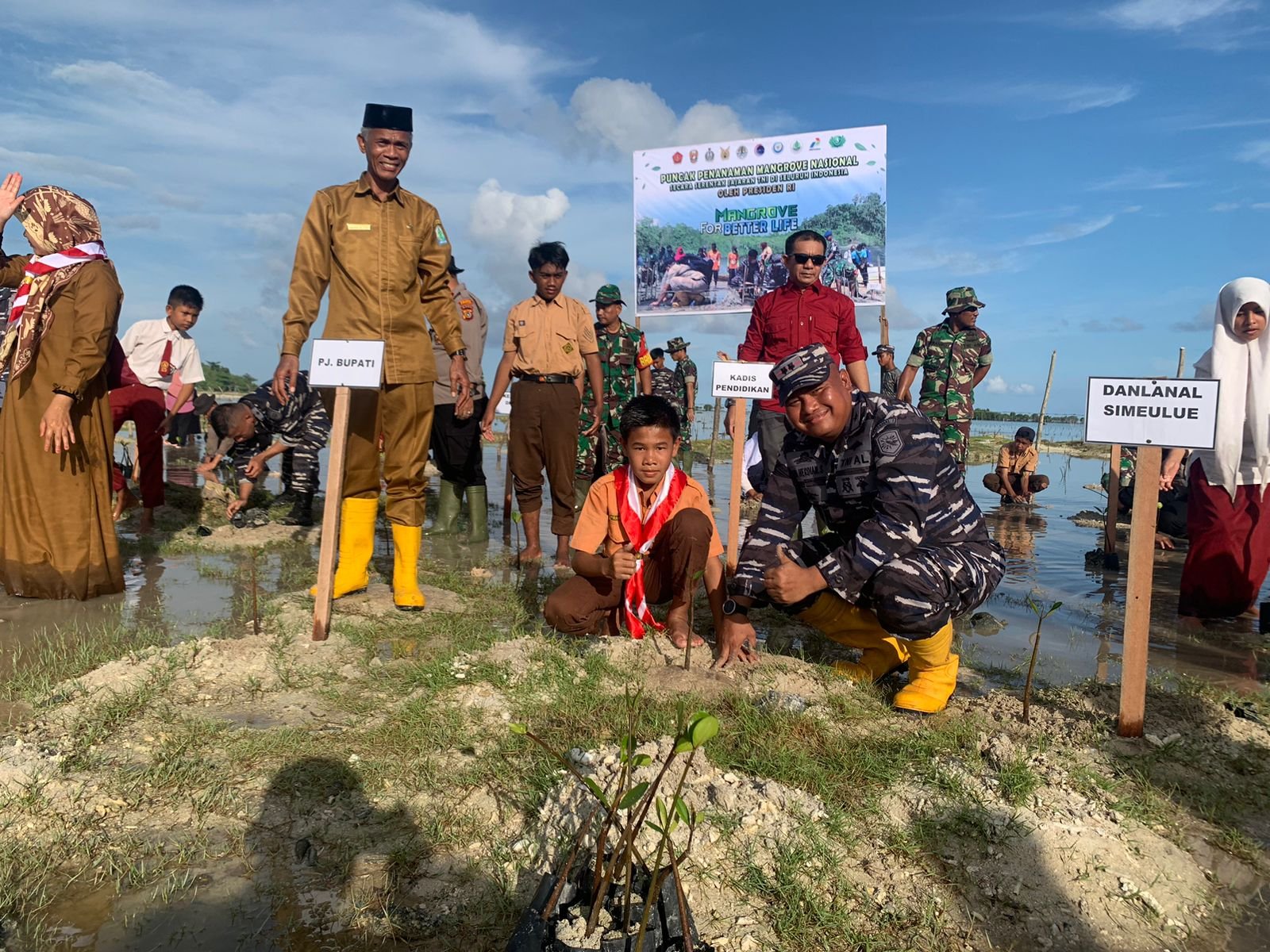 TNI AL, Komandan Lanal Simeulue Letkol Laut (P) Dwi Herdian Saputra, M.Tr.Opsla., bersama seluruh unsur Forkopimda serta masyarakat melaksanakan penanaman mangrove secara serentak di Desa Labuhan Bakti, Kec. Teupah Selatan, Kab. Simeulue. Senin (15/05/2023)