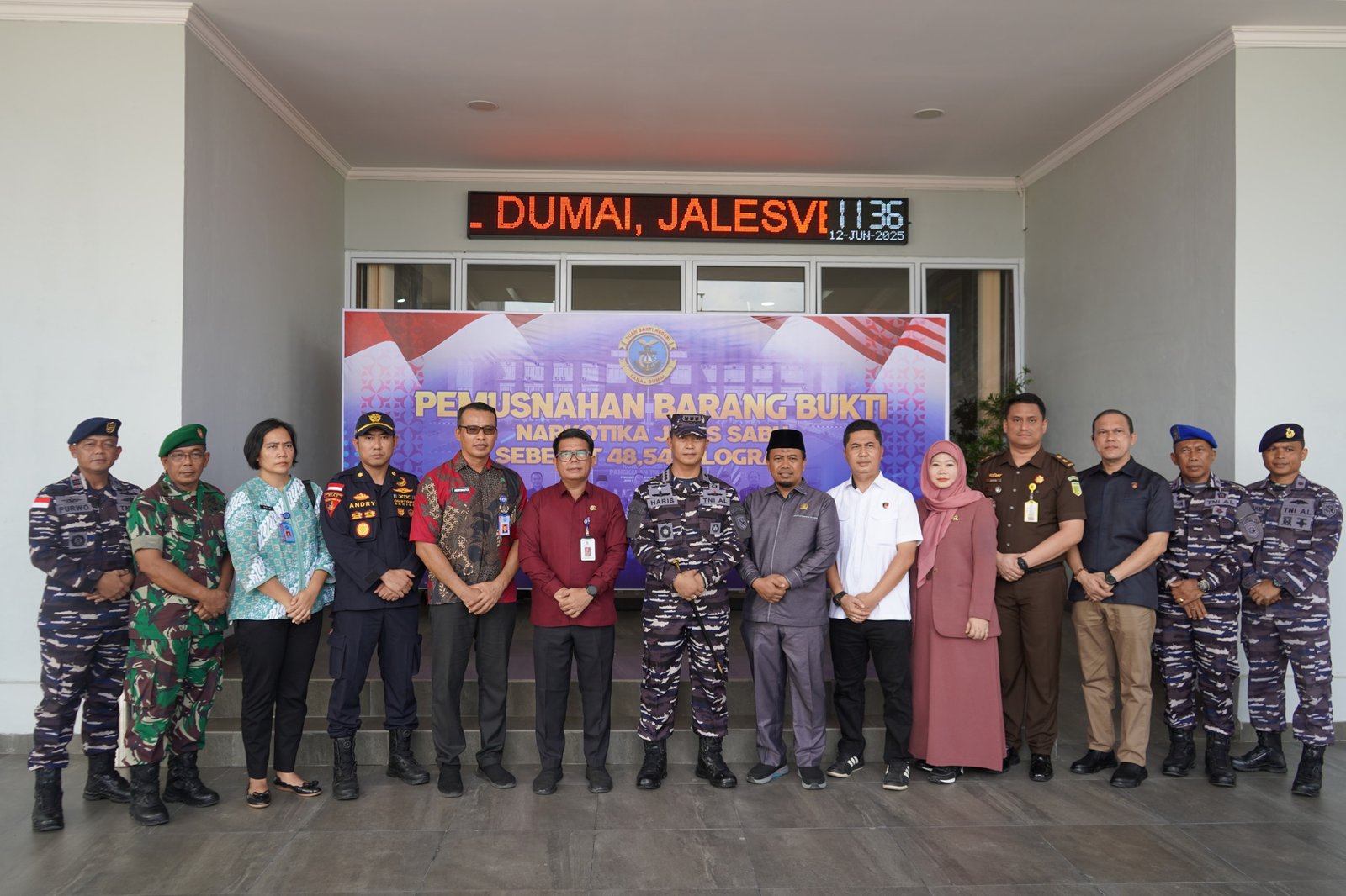 refubliknews.com, || TNI AL, Dumai,- Dalam upaya nyata memberantas peredaran narkoba di Indonesia, Pangkalan TNI Angkatan Laut (Lanal) Dumai menggelar acara pemusnahan barang bukti narkotika jenis sabu seberat 48,54 Kg di Mako Lanal Dumai, Jalan Yos Soedarso No.01, Kota Dumai. Acara ini dipimpin langsung oleh Komandan Lanal Dumai Kolonel Laut (P) Abdul Haris S.E., M.M.D.S., yang didampingi oleh (PJU) Lanal Dumai, Kamis (12/6/2025).