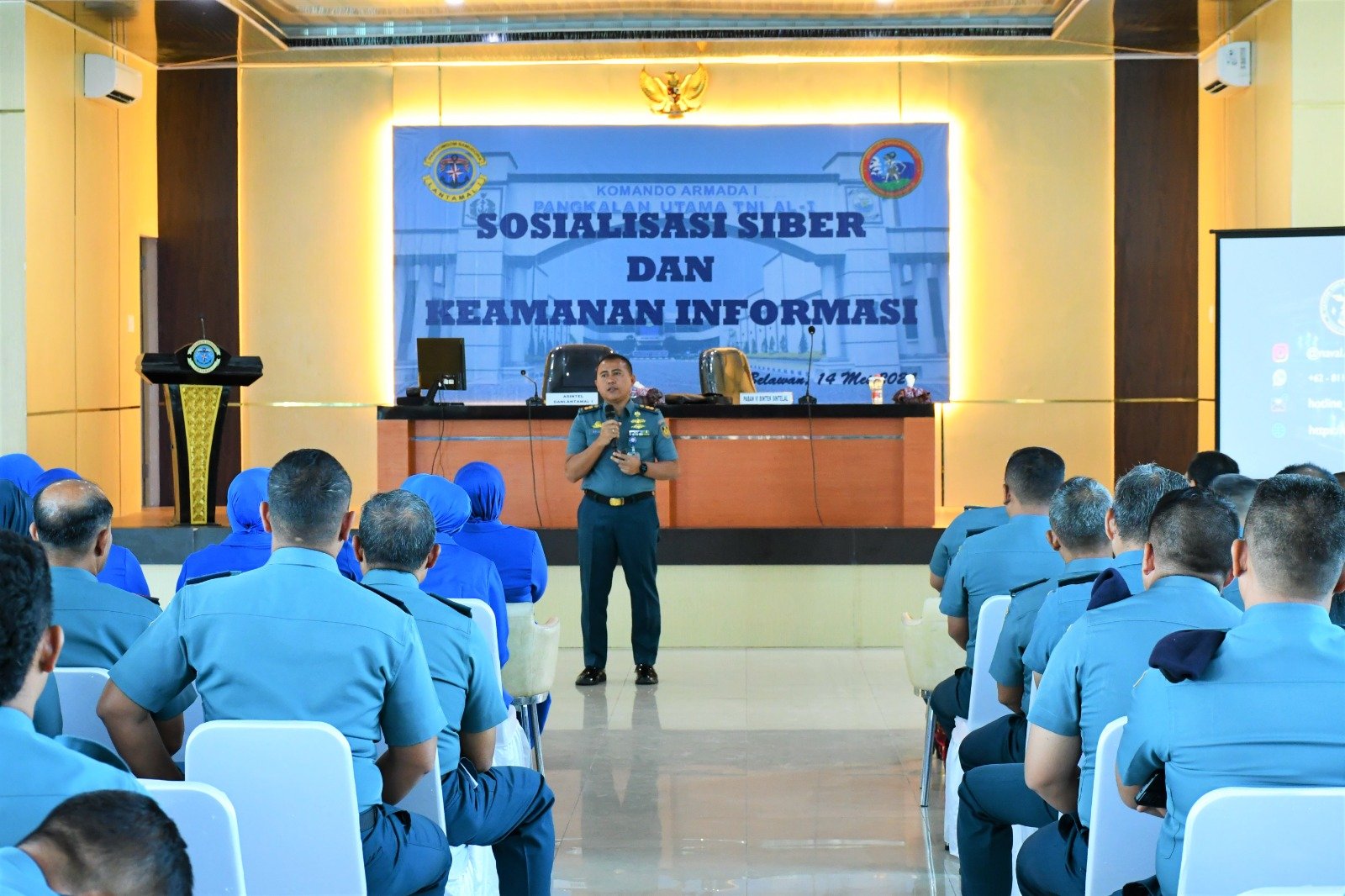 TNI AL, Belawan,- Komandan Pangkalan Utama TNI Angkatan Laut I (Danlantamal l) Brigjen TNI (Mar) Jasiman Purba, S.E., CHRMP., yang diwakili oleh Asintel Danlantamal I Kolonel Laut (P) Suryadi Permana, S.E., M.Tr. Opsla., membuka acara Sosialisasi Siber dan Keamanan Informasi dari Tim Satsiber Mabes TNI AL, dipimpin oleh Paban VI Sintelal Kolonel Laut (E) Yusrizal, bertempat di Gedung OB Syaaf Mako Lantamal I, Jalan Serma Hanafiah No. 01 Belawan, Sumatera Utara, Selasa (14/5/2024).