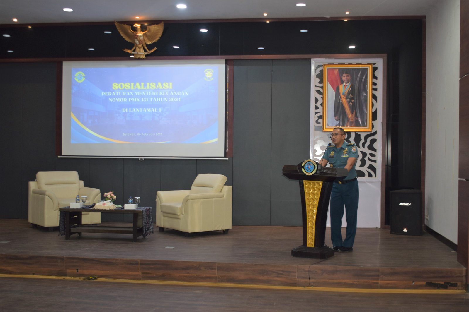 refubliknews.com, – TNI AL, Belawan,- Komandan Pangkalan Utama TNI Angkatan Laut I (Danlantamal I) Brigjen TNI (Mar) Jasiman Purba, S.E., CHRMP., diwakili Kakuwil Lantamal I Kolonel Laut (S) Irwan Kurniawan, M.Tr. Hanla., menghadiri Sosialisasi Peraturan Menteri Keuangan Nomor PMK 131 Tahun 2024, bertempat di Gedung Jos Sudarso Mako Lantamal I Belawan, Kamis (6/2/2025).