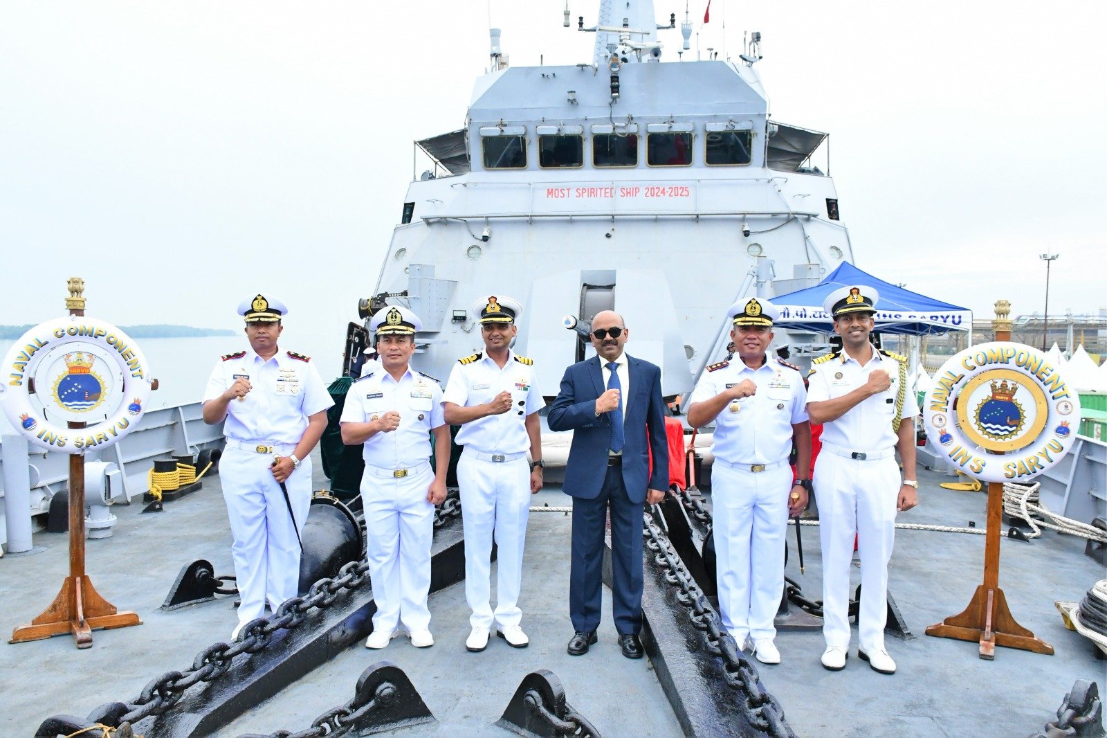 Turut hadir dalam penyambutan INS Saryu P54, Dansatrol Lantamal I, Kadis/Kasatker Lantamal I, para Komandan KRI yang sandar di Belawan, Conjen India H. E. Mr. Ravi Shanker Goel, Athan India