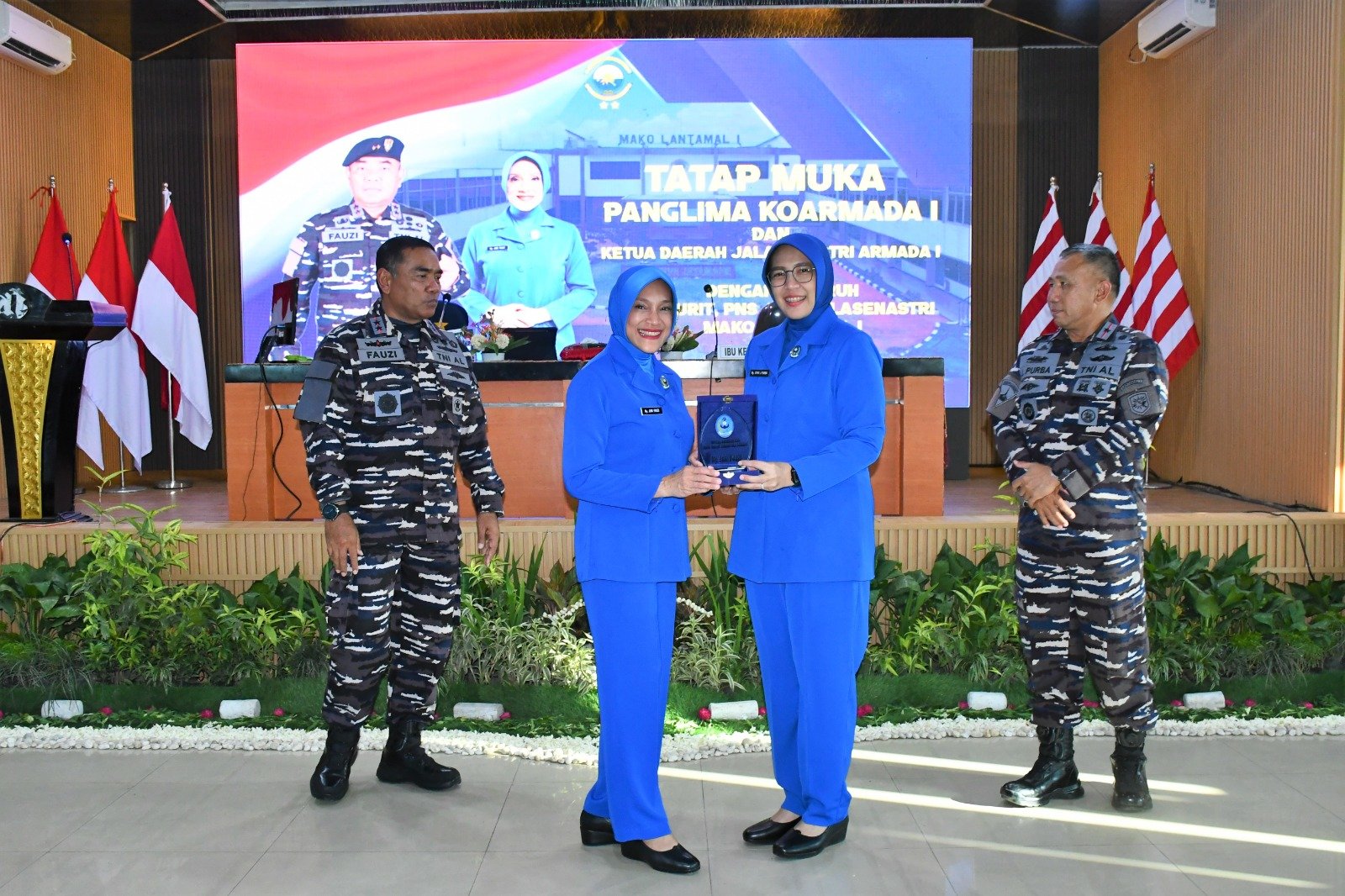 Panglima Koarmada I yang didampingi Ketua Daerah Jalasenastri Armada I dalam kunjungan ini berkesempatan melaksanakan tatap muka dan pengarahan kepada seluruh Personel Lantamal I dan Pengurus Korcab I DJA I di Gedung OB. Syaaf Mako Lantamal I.
