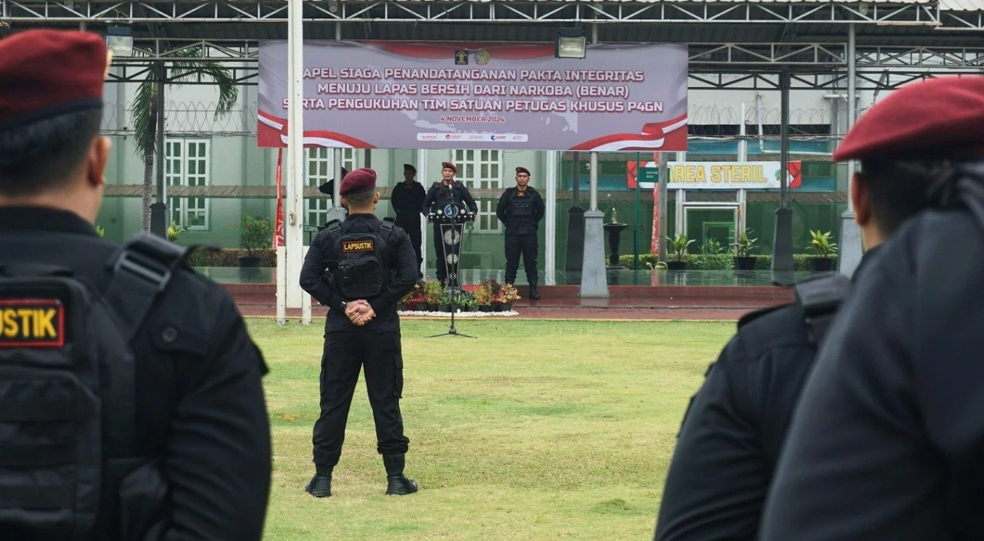 Lapas Narkotika Jakarta menggelar apel siaga dan penandatanganan pakta integritas. Acara yang berlangsung khidmat ini juga diwarnai dengan pengukuhan Tim Satuan Petugas Khusus Pencegahan, Pemberantasan, Penyalahgunaan, dan Peredaran Gelap Narkotika (P4GN).