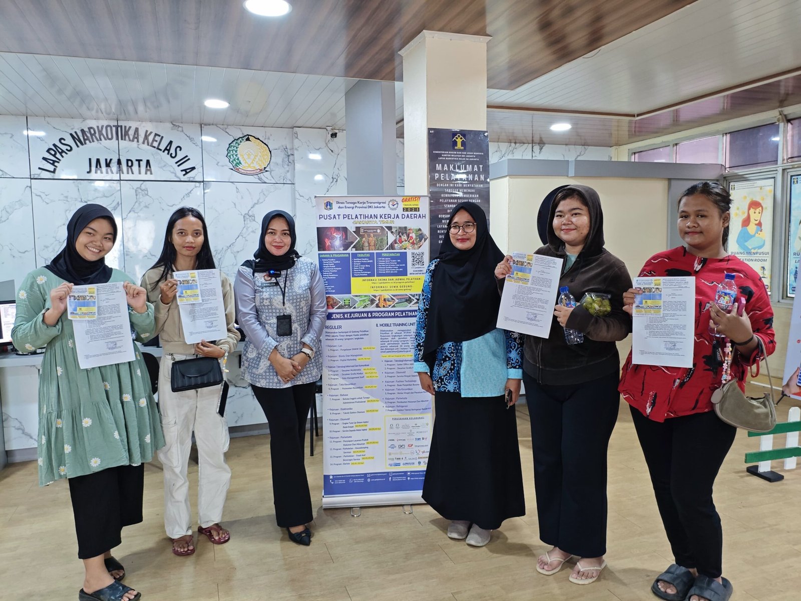 Lapas Narkotika Kelas IIA Jakarta turut serta membantu memberikan informasi kepada masyarakat mengenai Program-program Pelatihan yang akan diselenggarakan PPKD Jakarta Timur pada tahun 2025 ini melalui pemasangan standing banner Informasi pelatihan dan persyaratannya yang ditempatkan di ruang pendaftaran kunjungan Lapas Narkotika Kelas IIA Jakarta. Selain itu, petugas dan duta layanan kunjungan juga secara khusus menyampaikan informasi mengenai pelatihan yang diselenggarakan PPKD Jakarta Timur tahun 2025 ini melalui penyampaian secara interaksi langsung dan pembagian surat informasi beserta flyer kegiatan pelatihan tersebut.
