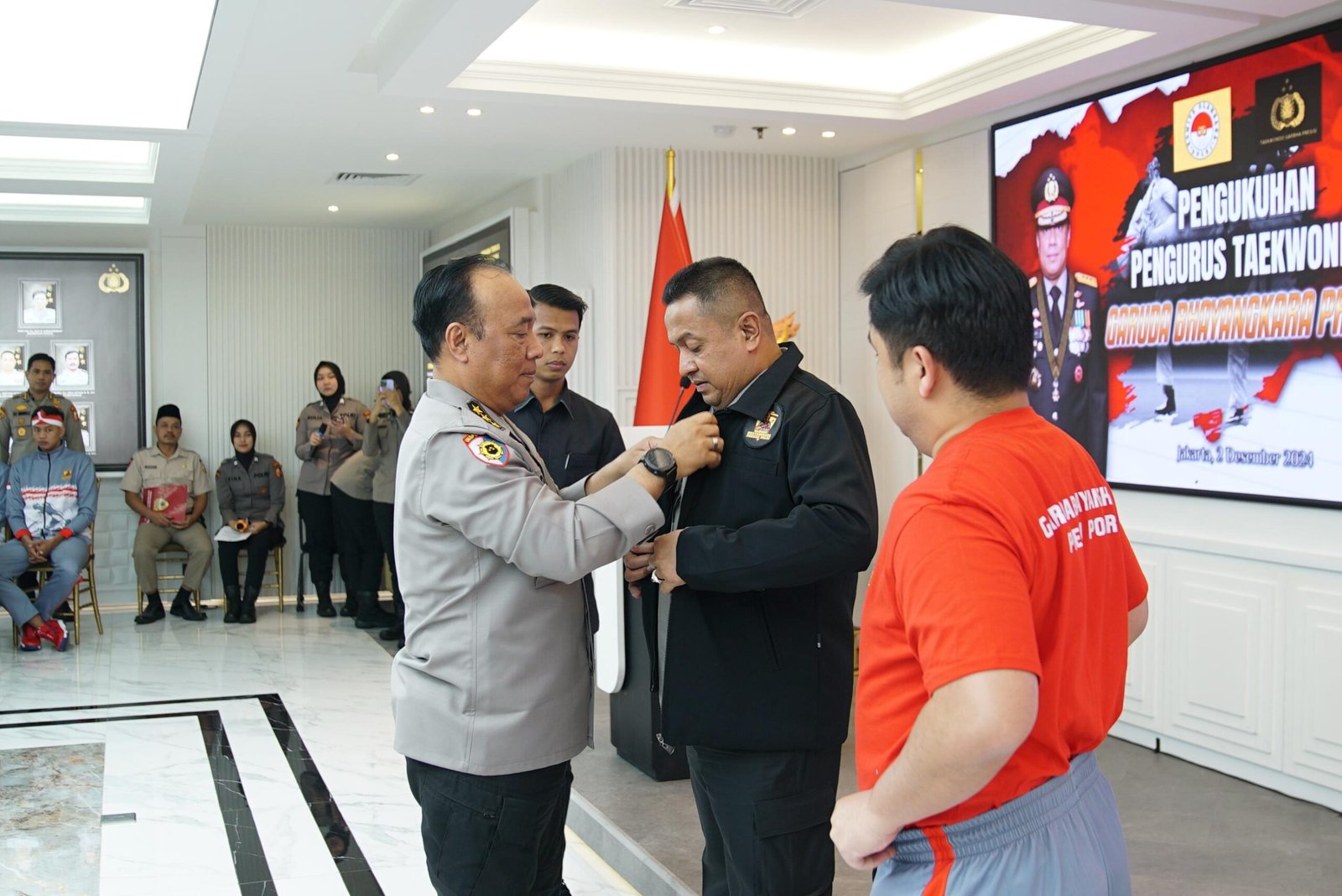 Turut hadir dalam pelantikan dan pelepasan atlet taekwondo Indonesia Garbha Presisi ke Vietnam, Sekjen Koni Pusat Tb Lukman Djajadi, Sekjen PBTI Mayor Jenderal TNI Amrin Ibrahim, Karobinkar SSDM Polri Brigjen Pol Langgeng Purnomo, Karowatpers SSDM Polri Brigjen Pol Budhi Herdi Susianto.