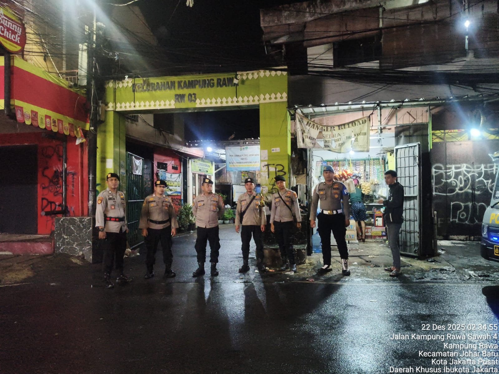 Jakarta Pusat — Memasuki masa libur sekolah, Polsek Johar Baru meningkatkan kegiatan Patroli Cipta Kondisi Antisipasi Gangguan Kamtibmas (Guantibmas) guna menjaga situasi keamanan dan ketertiban masyarakat tetap aman dan kondusif, khususnya pada jam rawan, Senin (22/12/2025) dini hari.