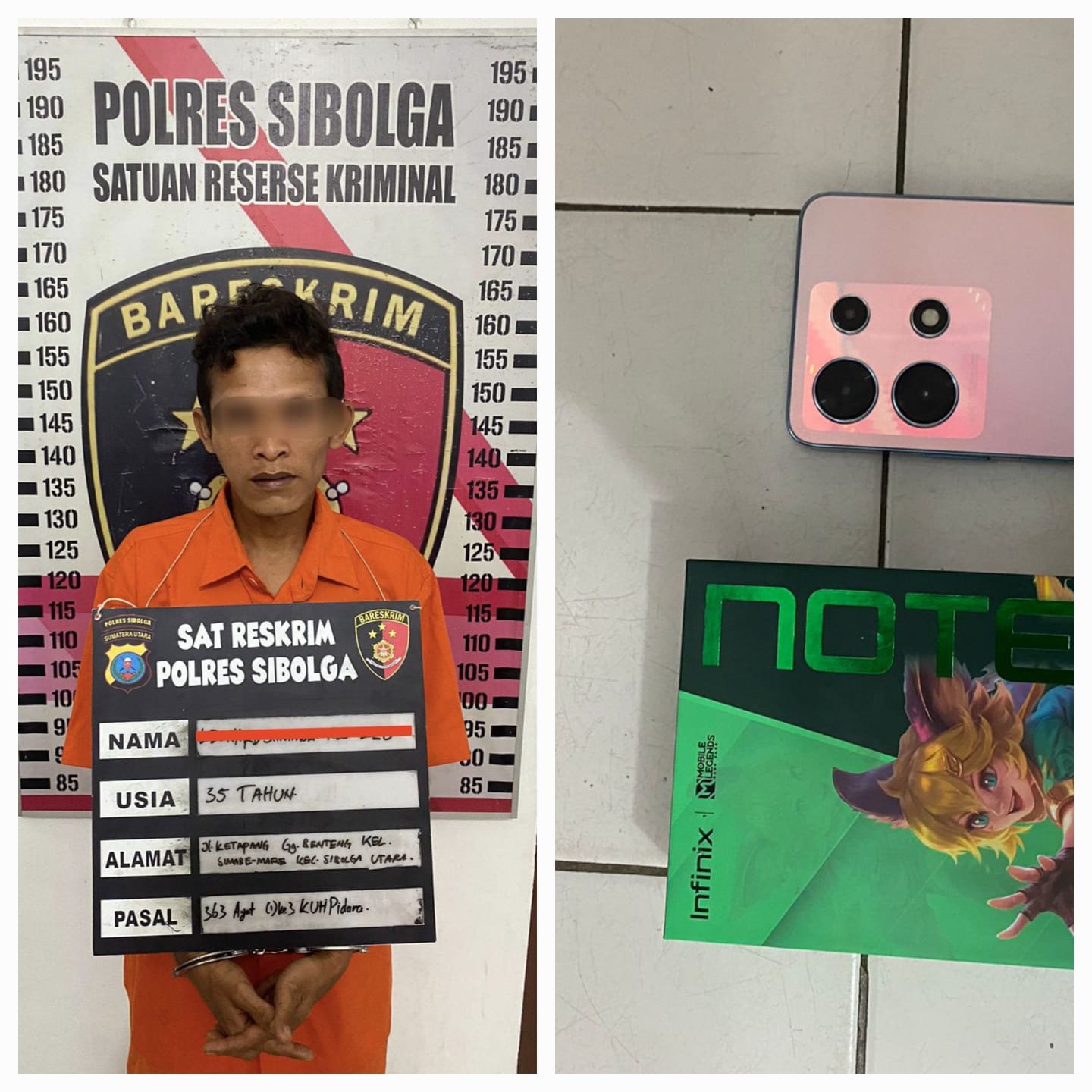Pada Senin, tanggal 17 Juni 2024 sekitar pukul 18.20 WIB, Tim Opsnal Sat Reskrim Polres Sibolga menerima informasi mengenai keberadaan pelaku di Jl. Ketapang Gg. Benteng. Tim Opsnal Sat Reskrim Polres Sibolga, segera menuju lokasi dan berhasil mengamankan LS Alias L, beserta Barang Bukti berupa satu unit handphone Infinix NOTE 30 warna biru yang sesuai dengan IMEI yang dilaporkan hilang. Setelah diinterogasi, Pelaku mengakui perbuatannya dan kini pelaku serta Barang Bukti telah diamankan di Polres Sibolga untuk proses lebih lanjut.