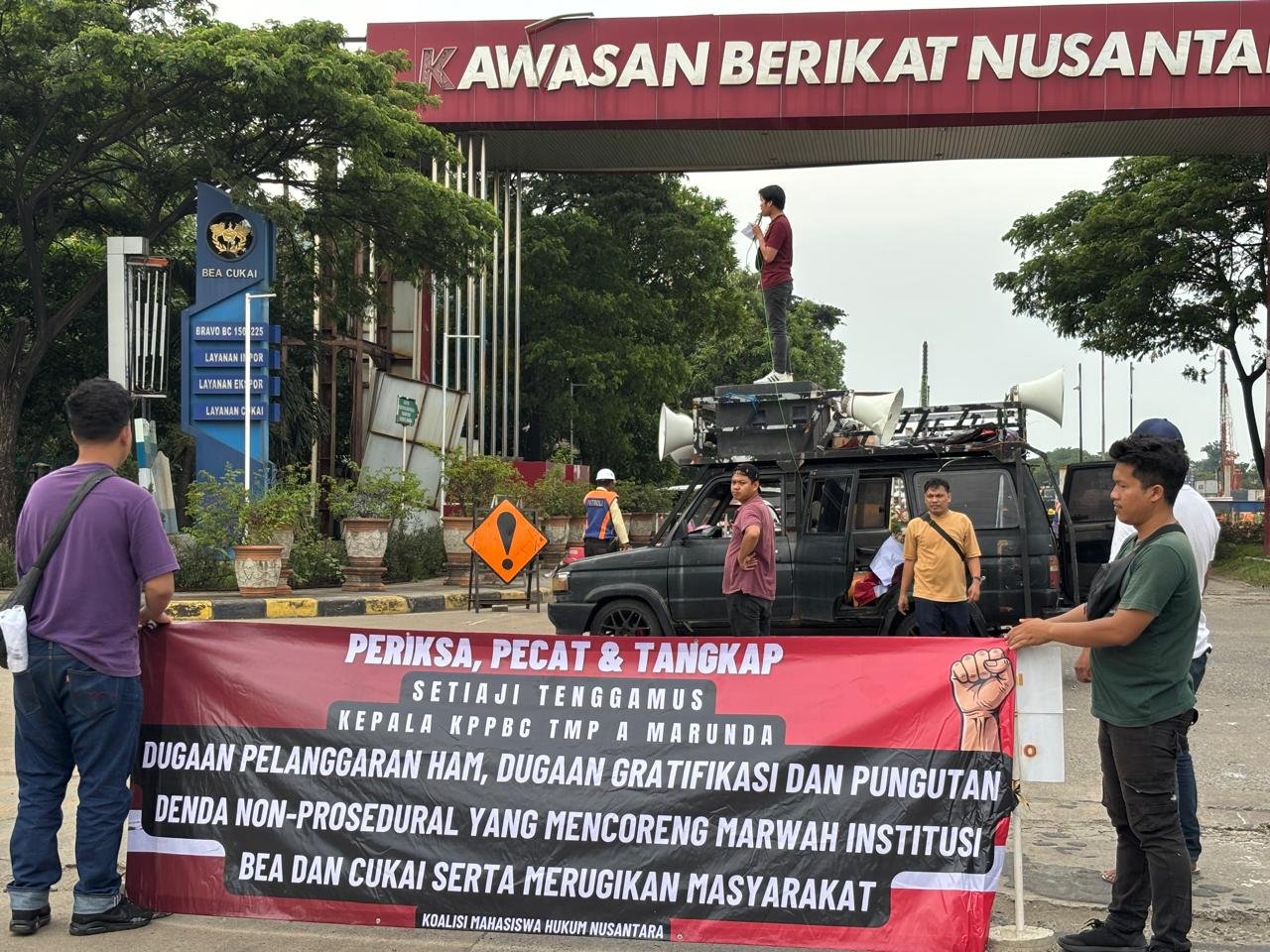 “Kami tegas menyatakan sikap dan mendesak agar Setiaji Tenggamus diperiksa dan dicopot atas dugaan sejumlah pelanggaran yakni pelanggaran Ham, dugaan gratifikasi serta pungutan denda non prosedural yang tentunya jika dibiarkan akan mencoreng marwah institusi”, tegas Gokma Purba, Kordinator KMHN, di Kantor Bea Cukai Marunda, senin (11/2/2026).