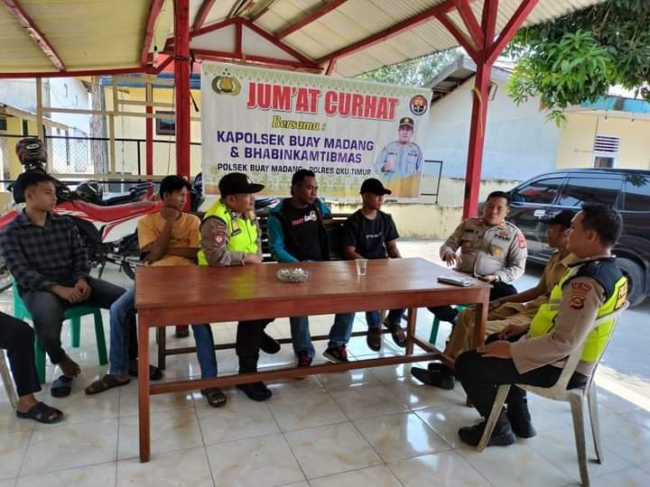 Kapolsek Buay Madang Polres Oku Timur Polda Sumsel, Akp Yudhi Cahyono bersama personil Polsek pimpin giat Jum’at Curhat yang merupakan Program Prioritas Kapolri yang bertujuan untuk menyerap suara dari masyarakat secara langsung. Kegiatan tersebut dilaksanakan di Desa Kurungan Nyawa Kecamatan Buay Madang, turut dihadiri oleh Kepala Kepala Desa beserta Perangkatnya, Tomas, Toga dan warga setempat, Jum’at (27-10-2023).