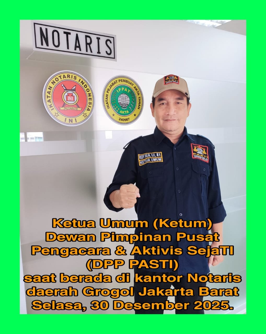 Jakarta. – Hari ini Selasa, 30 Desember 2025, pimpinan tertinggi Pengacara & Aktivis SejaTI (PASTI), yakni RUDY SILFA, SH, MH sebagai Ketua Umum (Ketum) DPP PASTI mendatangi Kantor Notaris di Jakarta Barat, untuk menerima Akta Notaris+SK Menkum RI dan Sertifikat dari Perum Percetakan Negara RI, untuk “Perkumpulan Pengacara & Aktivis SejaTI (PASTI)”.