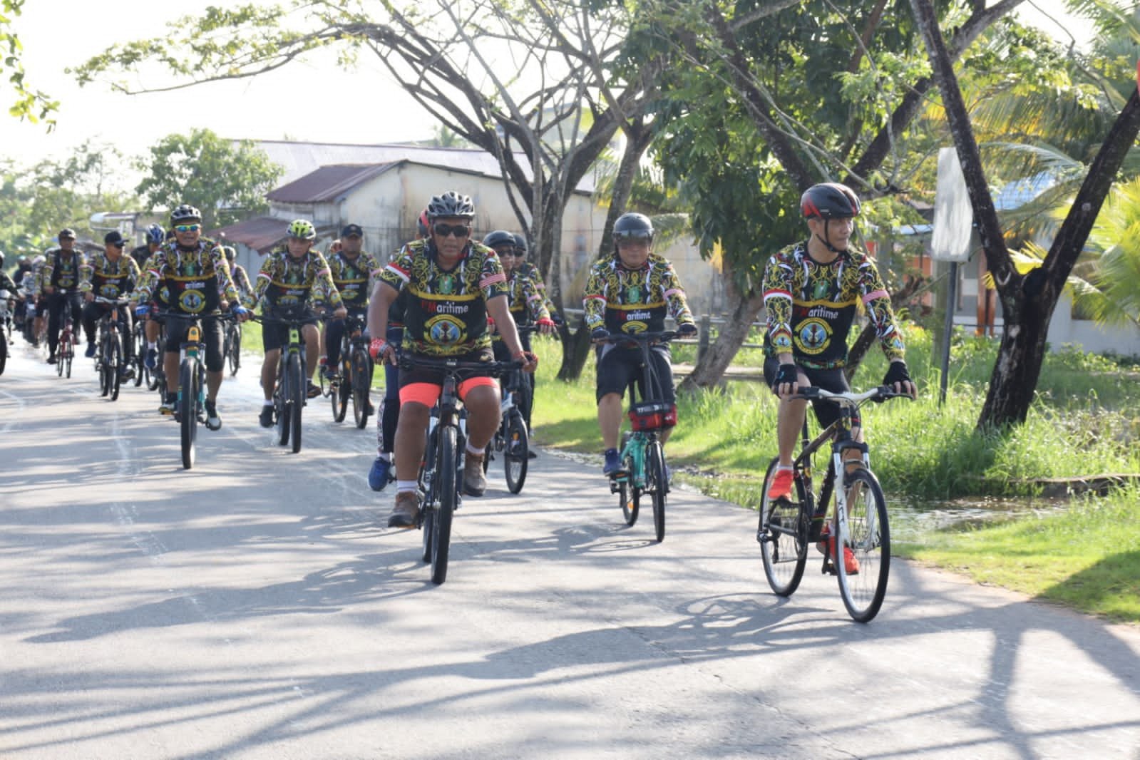 Mempawah, Lantamal XII,- Komandan Lantamal XII Laksamana Pertama TNI Suharto, S.H., M.Si.(Han) bersama Pejabat Utama, Kadis, Kasatker dan Perwira serta Prajurit Lantamal XII melaksanakan gowes bersama dalam giat Fun Bike Bersama Danlantamal XII, Sabtu (29/10/2022).