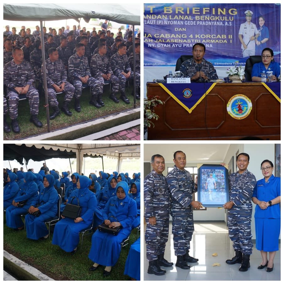 TNI AL, Bengkulu,- Jelang Upacara Serah Terima Jabatan, Komandan Pangkalan TNI Angkatan Laut (Danlanal) Bengkulu Letkol Laut (P) Nyoman Gede Pradnyana A.S beserta Ketua Jalasenastri Cabang 4 Korcab II DJA I Ny. Dyah Ayu Pradnyana melaksanakan Exit Briefing dengan seluruh Prajurit, PNS dan Jalasenastri Lanal Bengkulu, bertempat di Mako Lanal Bengkulu, Jalan R.E. Martadinata No. 10, Kelurahan Sumber Jaya, Kecamatan Kampung Melayu, Kota Bengkulu. Jum’at (28/07/2023).