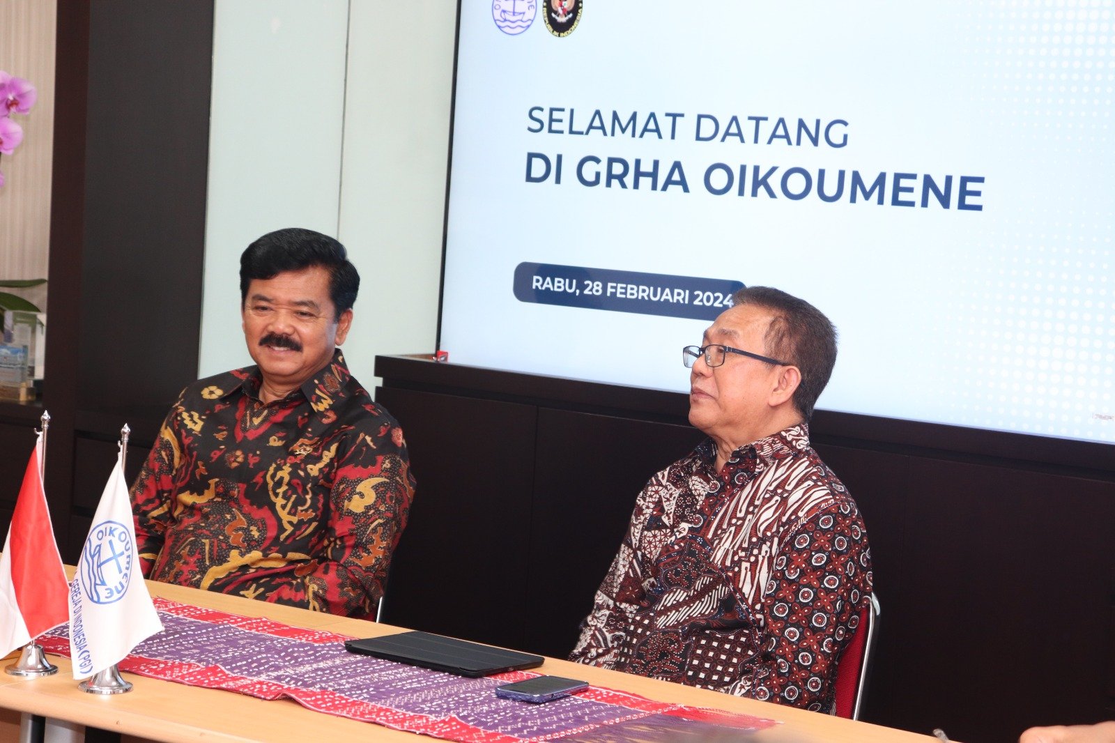 Menteri Koordinator Bidang Politik, Hukum, dan Keamanan (Menko Polhukam) Marsekal TNI (Purn.) Hadi Tjahjanto mengunjungi Kantor Persekutuan Gereja-Gereja di Indonesia (PGI), Gedung Grha Oikoumene, di Jalan Salemba Raya 10, Jakarta, pada Rabu (28/2/2024).