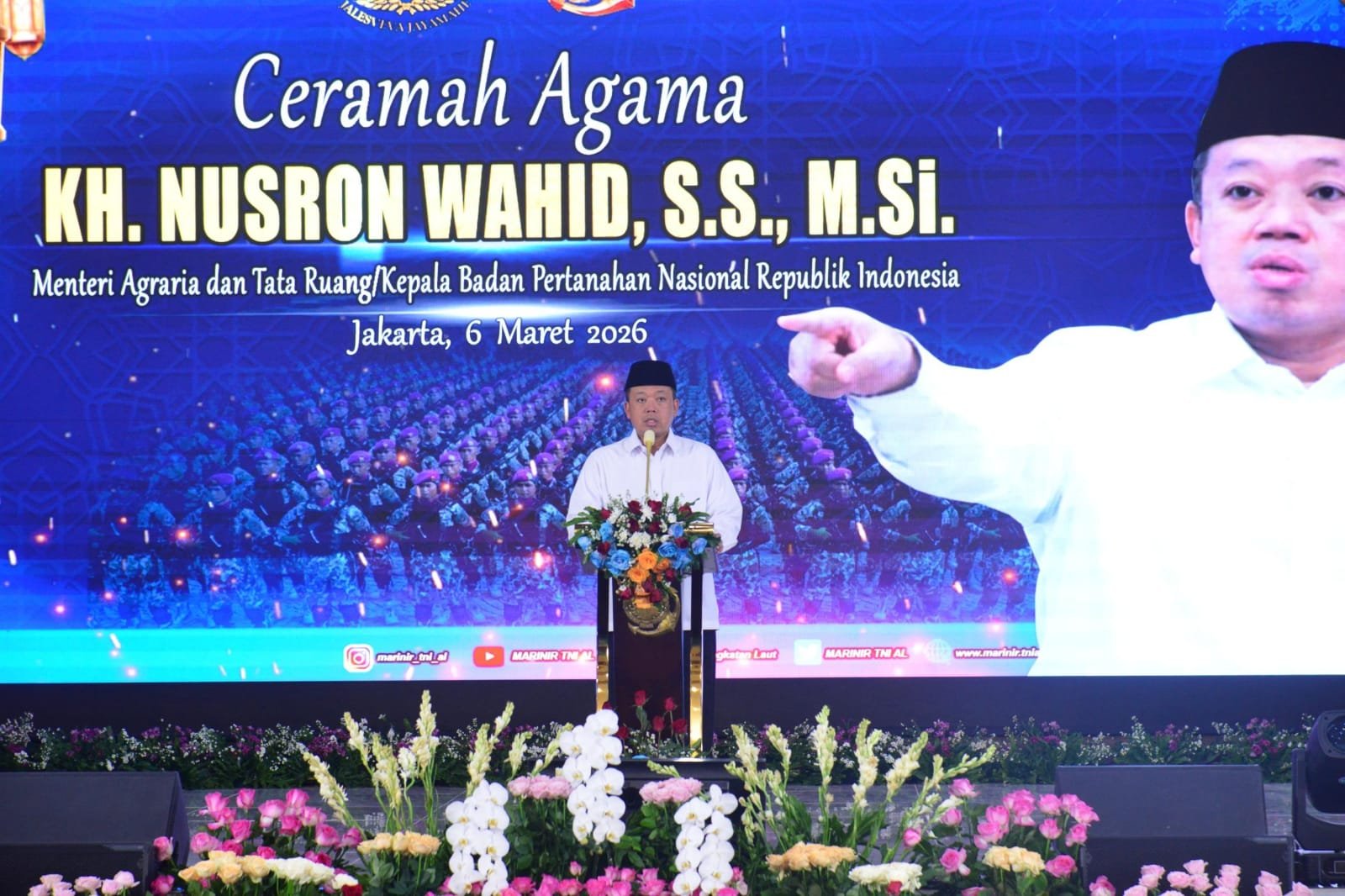 refubliknews.com, || (Jakarta). Menteri Agraria dan Tata Ruang/Kepala Badan Pertanahan Nasional Republik Indonesia (Menteri ATR/BPN RI) KH. Nusron Wahid, S.S., M.Si., bersama Kepala Staf Angkatan Laut (Kasal) Laksamana TNI Dr. Muhammad Ali, S.E., M.M., M.Tr.Opsla., menghadiri kegiatan santunan anak yatim yang dirangkaikan dengan peringatan Nuzulul Qur’an serta buka puasa bersama Prajurit Korps Marinir TNI Angkatan Laut. Kegiatan tersebut digelar di Graha Aminullah Ibrahim, Kesatrian Marinir Hartono Cilandak, Jakarta Selatan, Jumat (06/03/2026).