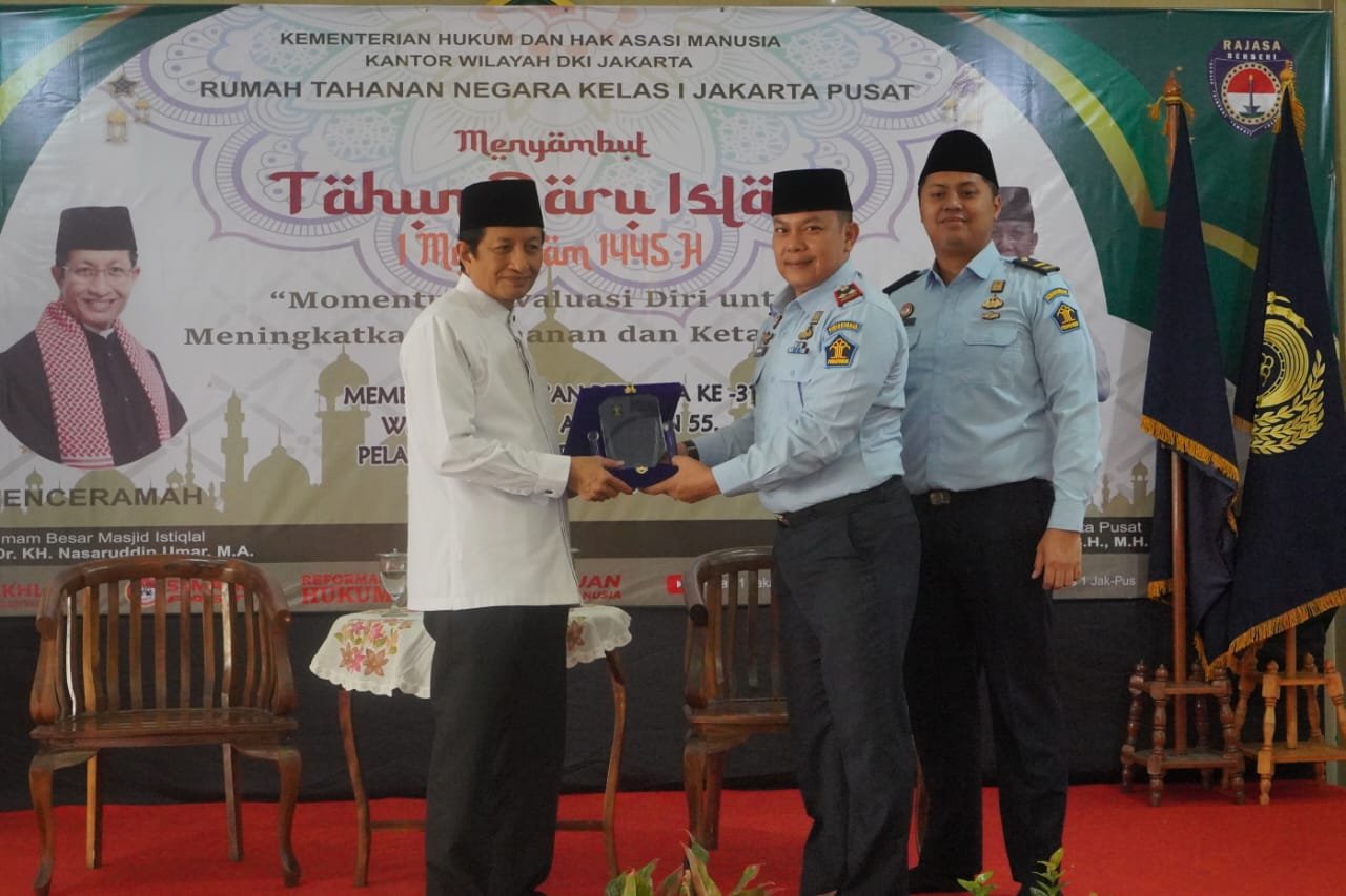 Selasa (18/07), Rutan Kelas I Jakarta Pusat menggelar berbagai rangkaian acara di Masjid At-Taubah dalam rangka menyambut Tahun Baru Islam 1445 H. Dalam rangkaian acara ini hadir pula tamu agung dan terhormat yakni Imam Besar Masjid Istiqlal Prof.Dr.KH.Nasarudin Umar yang juga merupakan Mantan Wakil Menteri Agama RI Periode 2011-2014. Kedatangan Prof.Dr.KH.Nasarudin Umar didampingi oleh Kepala Rutan Kelas I Jakarta Pusat, Fauzi Harahap beserta para Pejabat Struktural dan disambut dengan alunan Hadroh Santri At-Tawabien Rutan Kelas I Jakarta Pusat.