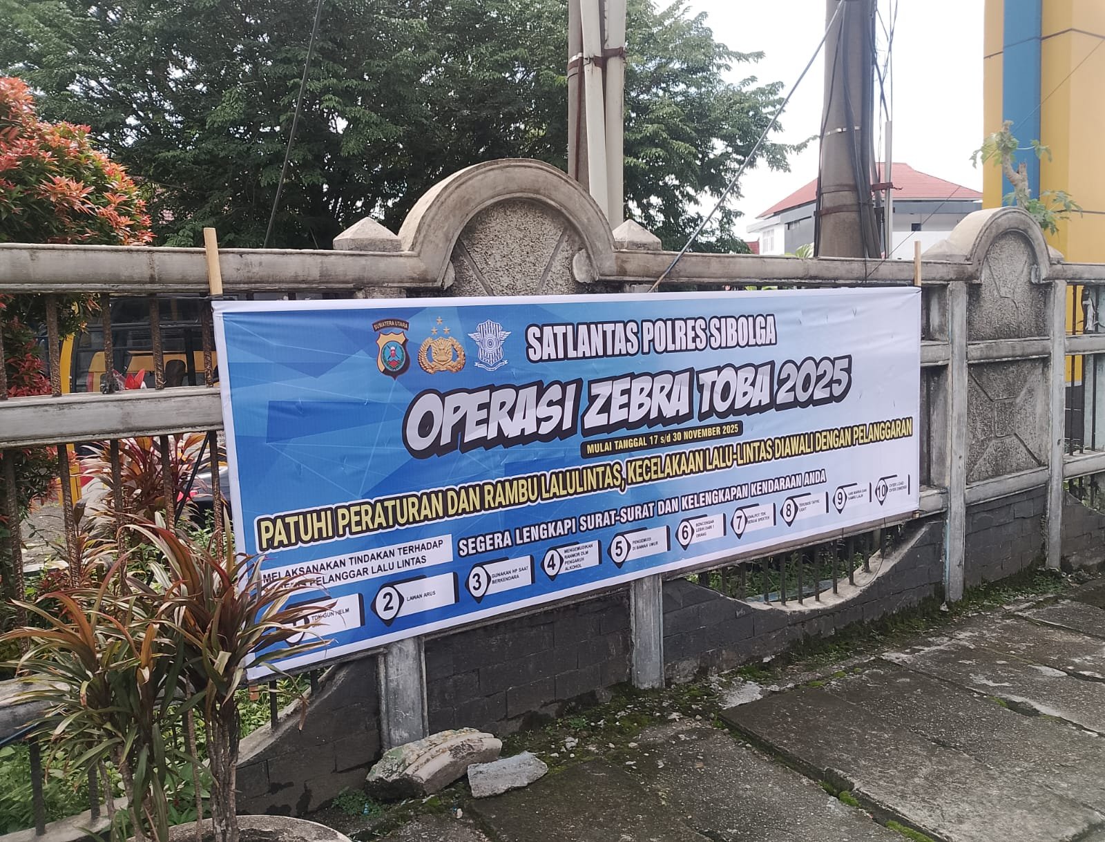 SIBOLGA Personel yang tergabung dalam satgas Operasi Zebra Toba 2025 Polres Sibolga hari ini memasang Spanduk tertib berlalu lintas, agar Masyarakat mengetahui Polres Sibolga sedang melaksanakan Ops Zebra Toba 2025, di Wilayah Hukum Polres Sibolga, Selasa (18/11/2025).