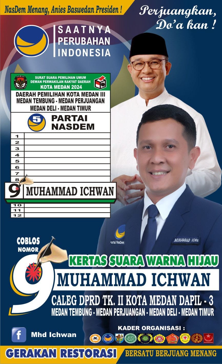 Muhammad Ichwan pun mengungkapkan puji syukur kepada Allah SWT,p seraya berterima kasih kepada semua pihak, termasuk DPW Partai Nasdem Provinsi Sumatera Utara, DPW Liga Mahasiswa Nasdem Provinsi Sumatera Utara, DPD Partai Nasdem Kota Medan, Pengurus Liga Mahasiswa Nasdem Kota Medan, Bawaslu Kota Medan dan KPU Kota Medan di seluruh tingkatan serta timnya dan masyarakat.