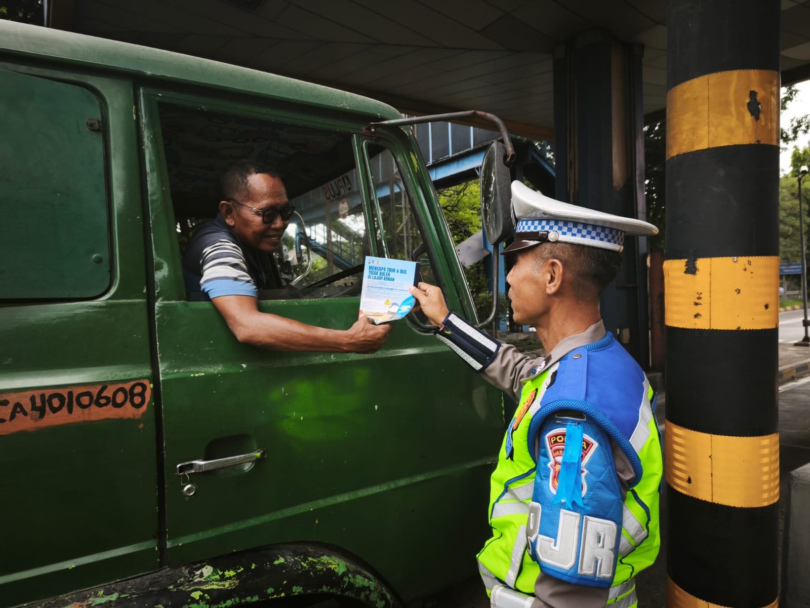 Kali ini melalui Satuan PJR (Patroli Jalan Raya), Ditlantas Polda Jatim membagikan flyer kepada pengguna jalan khususnya jalan tol.