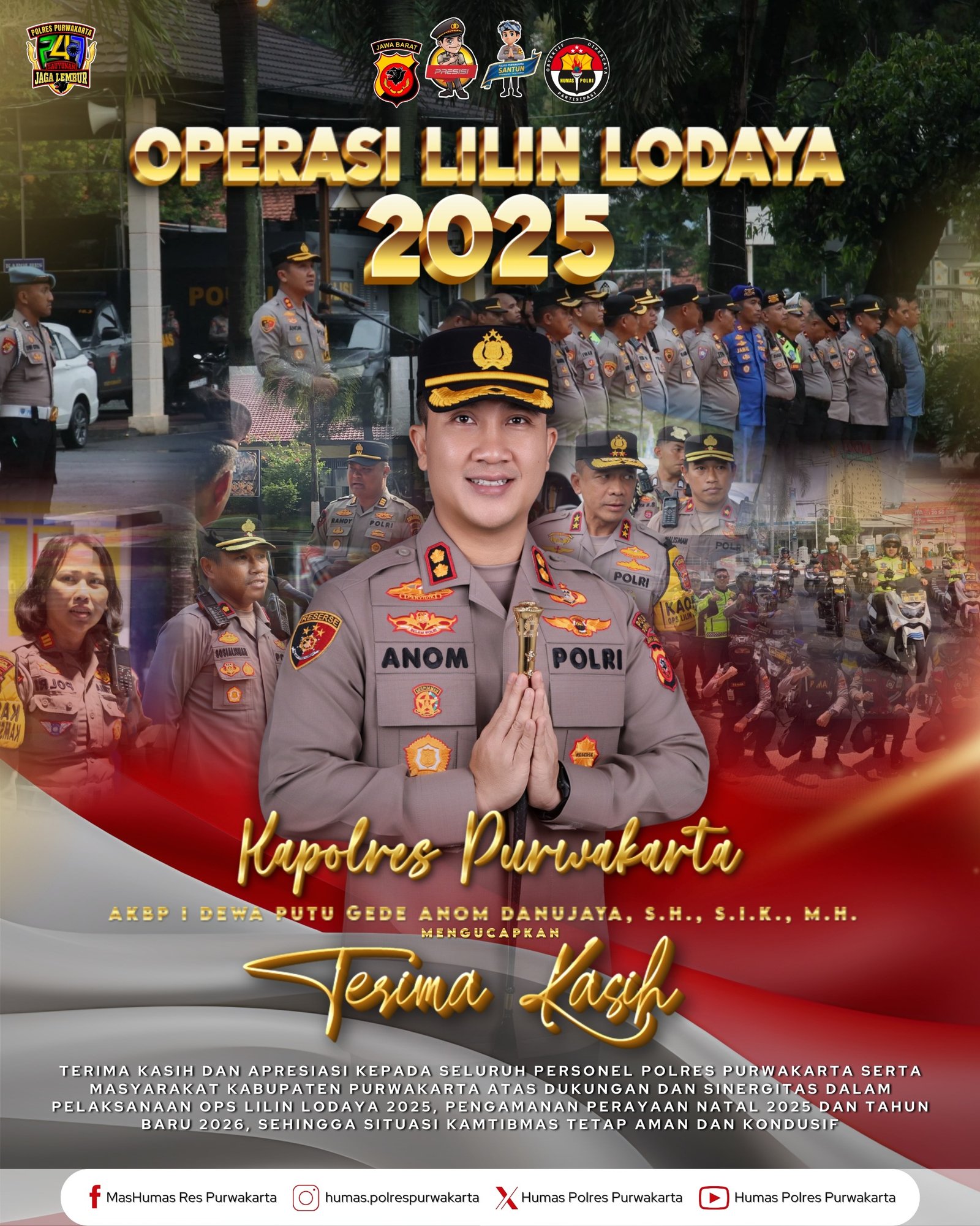 Dengan demikian, Kapolres menyampaikan ucapan terima kasih kepada segenap lapisan masyarakat Kabupaten Purwakarta, atas peran serta dan partisipasinya dalam menjaga situasi kamtibmas yang kondusif, sehingga seluruh rangkaian kegiatan Operasi Lilin Lodaya 2025 dalam rangka pengamanan Natal dan Tahun Baru 2026 berjalan aman dan tertib.
