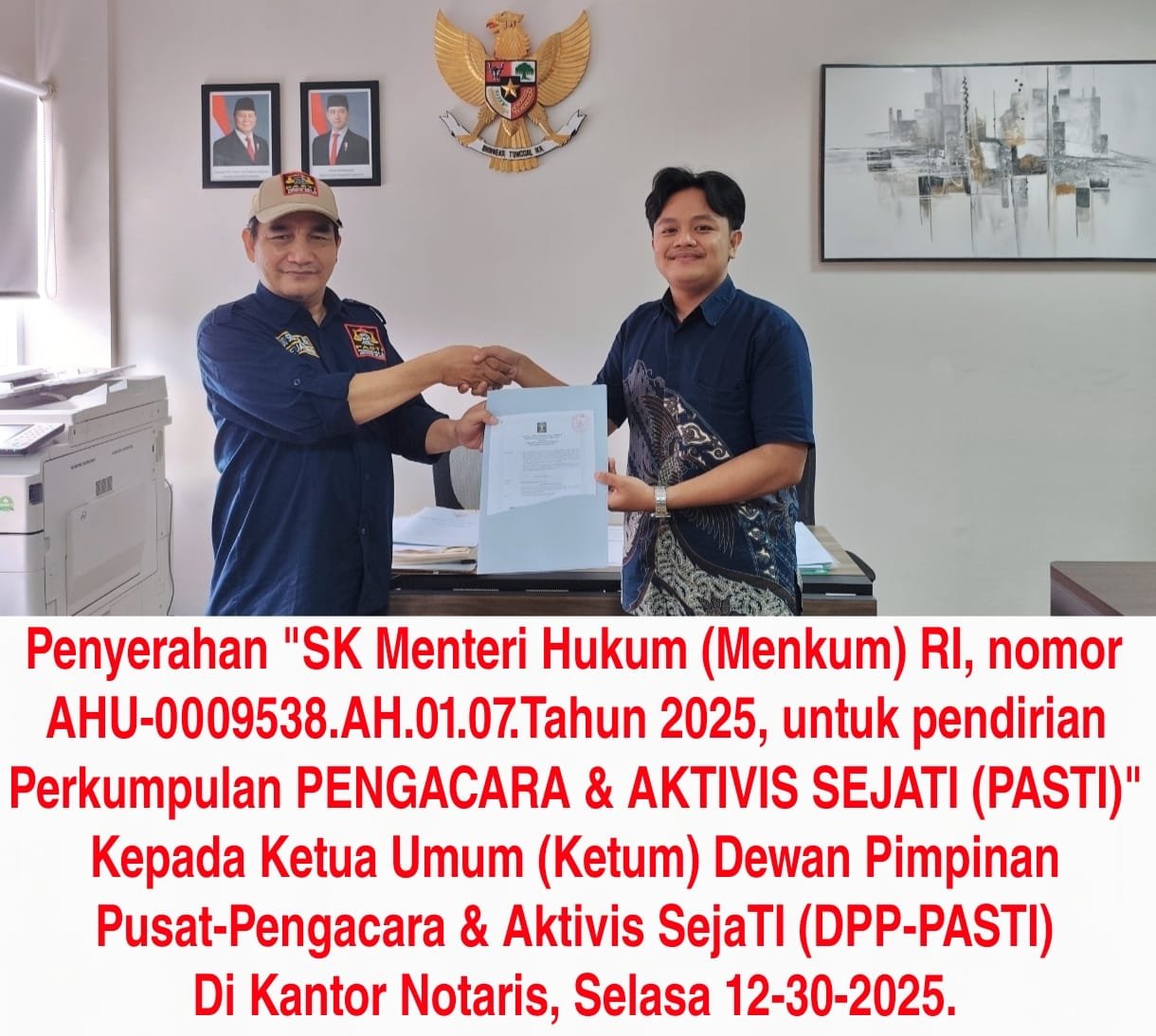 Ketua Umum sangat bersyukur, karena setelah penantian penuh kesabaran, hari ini akta notaris dan SK Menkum RI untuk legalitas Pengacara dan Aktivis Sejati (PASTI) resmi terbit.