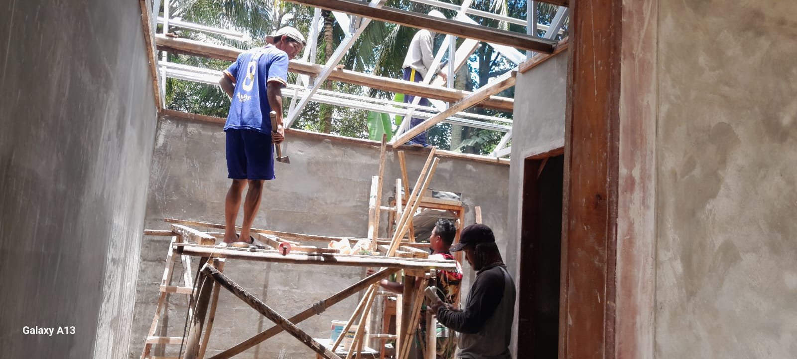 ” Untuk progres pekerjaannya yaitu pemasangan atap dan aci dari rumah Dadi progres sudah mencapai 70%,
