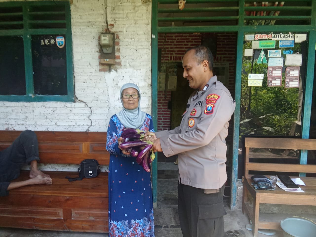 refubliknews.com,- Nganjuk – Polsek Wilangan melalui Kanit Binmas Aiptu Bambang Dwi S. memanen tanaman sayuran berupa terong di halaman kantor Polsek dan membagikannya kepada warga sekitar, salah satunya kepada Ibu Tutik yang tinggal di belakang Mapolsek, Minggu(13/4/2025).