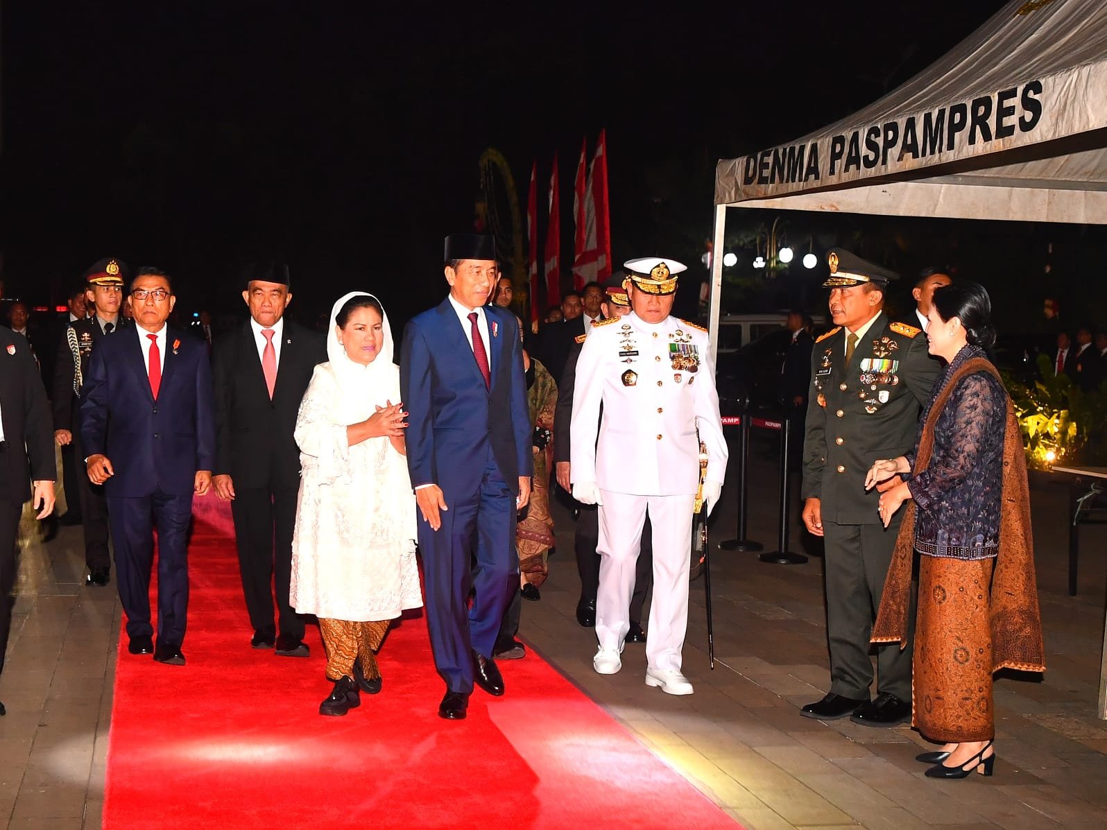 Presiden Republik Indonesia Ir. H. Joko Widodo dan Ibu Negara Ny. Iriana Joko Widodo didampingi Pangdam Jaya Mayjen TNI Mohamad Hasan dan Ibu Ketua Persit Kartika Chandra Kirana Daerah Jaya Ny. Ririx M. Hasan, bersama-sama para pejabat negara terlebih dahulu melakukan penghormatan di gerbang Taman Makam Pahlawan Nasional Utama Kalibata.