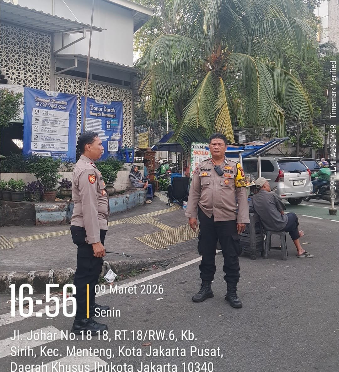 Jakarta Pusat – Untuk memastikan keamanan dan ketertiban masyarakat selama bulan suci Ramadhan, jajaran Polsek Metro Menteng melaksanakan pelayanan serta pengamanan pasar tumpah Ramadhan di kawasan Masjid Cut Nyak Dien yang berlokasi di Jalan Johar No. 7, Gondangdia, Menteng, Jakarta Pusat. Senin (9/3/2026)