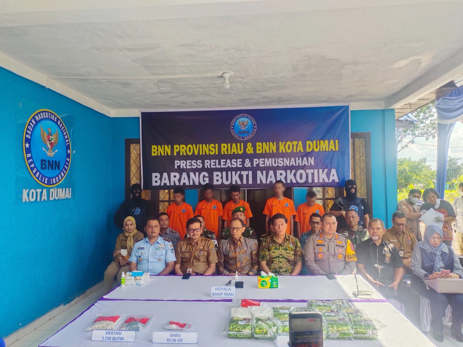 Pemusnahan Narkotika Golongan I jenis Sabu seberat bruto 15.159,98 (lima belas ribu seratus lima puluh sembilan koma sembilan puluh delapan) gram dan Ekstasi sebanyak 3.726 (tiga ribu tujuh ratus dua puluh enam) butir tersebut terdiri dari 3 (tiga) Laporan Kasus Narkotika dengan jumlah 5 (lima) orang Tersangka dari peredaran gelap Narkoba jaringan Narkotika yang terjadi di Wilayah Provinsi Riau. Pemusnahan barang bukti ekstasi dilakukan dengan cara diblender dan Sabu-sabu dilarutkan kedalam air panas kemudian dimasukkan kedalam galian tanah.
