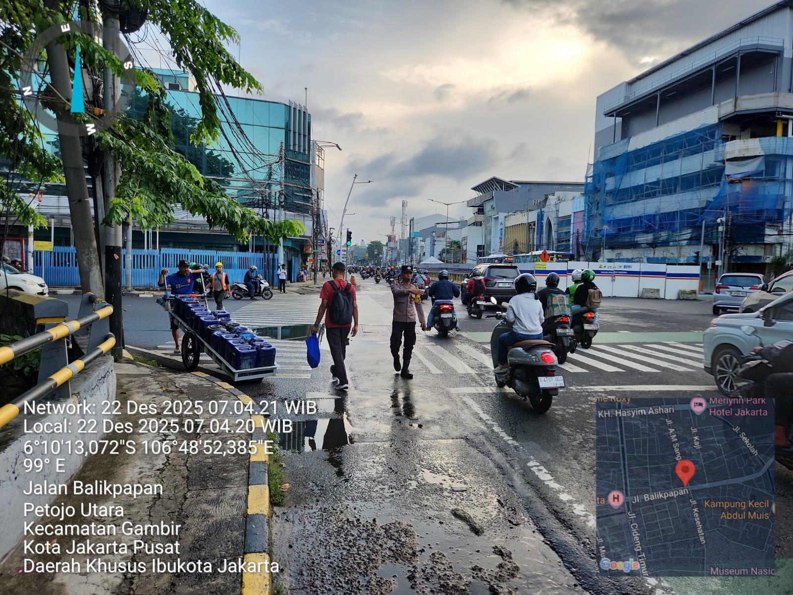 Jakarta Pusat – Kepadatan arus kendaraan pada pagi hari di kawasan Jl. Suryopranoto, kerap mengalami peningkatan yang signifikan seiring dengan jam berangkat kerja masyarakat. Untuk menjaga situasi tetap aman dan tertib, Petugas Polsek Metro Gambir melaksanakan kegiatan pengaturan lalu lintas di sekitar Traffic Light (TL) Kesehatan, Senin (22/12/2025) Pukul 07.00 Wib.