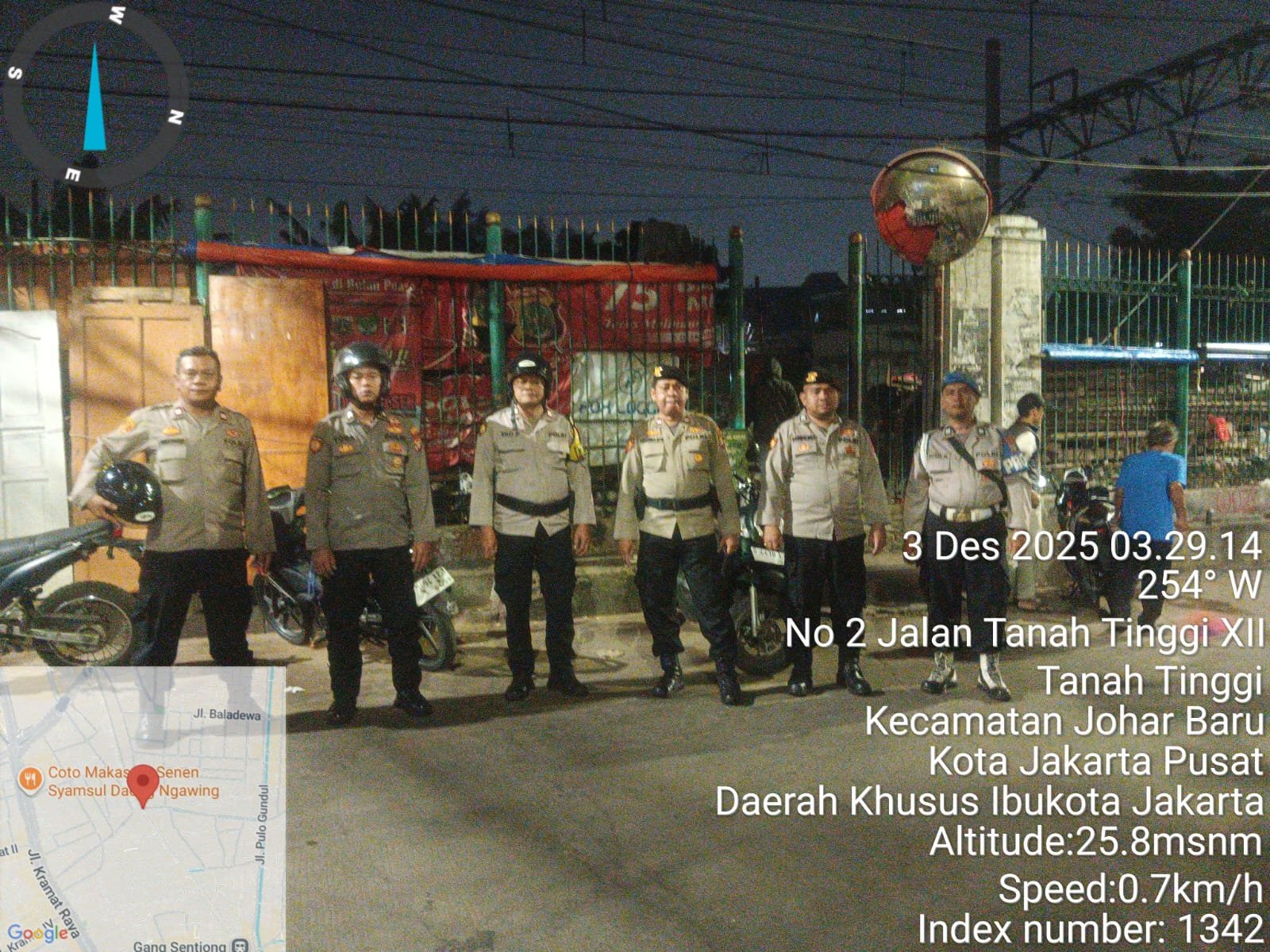 Setelah apel, patroli mobile dilakukan menyusuri sejumlah titik strategis, antara lain: Jl. Kramat Pulo Gundul, Jl. Kramat Jaya Baru, Jl. Kampung Rawa Sawah, Gang T, Jl. Galur Jaya, Jl. Letjen Suprapto, Jl. Tanah Tinggi IV, Jl. Baladewa, Jl. Tanah Tinggi I, Jl. Kampung Rawa Selatan dan kembali ke Jl. Kramat Jaya Baru dan Jl. Kramat Pulo Gundul.