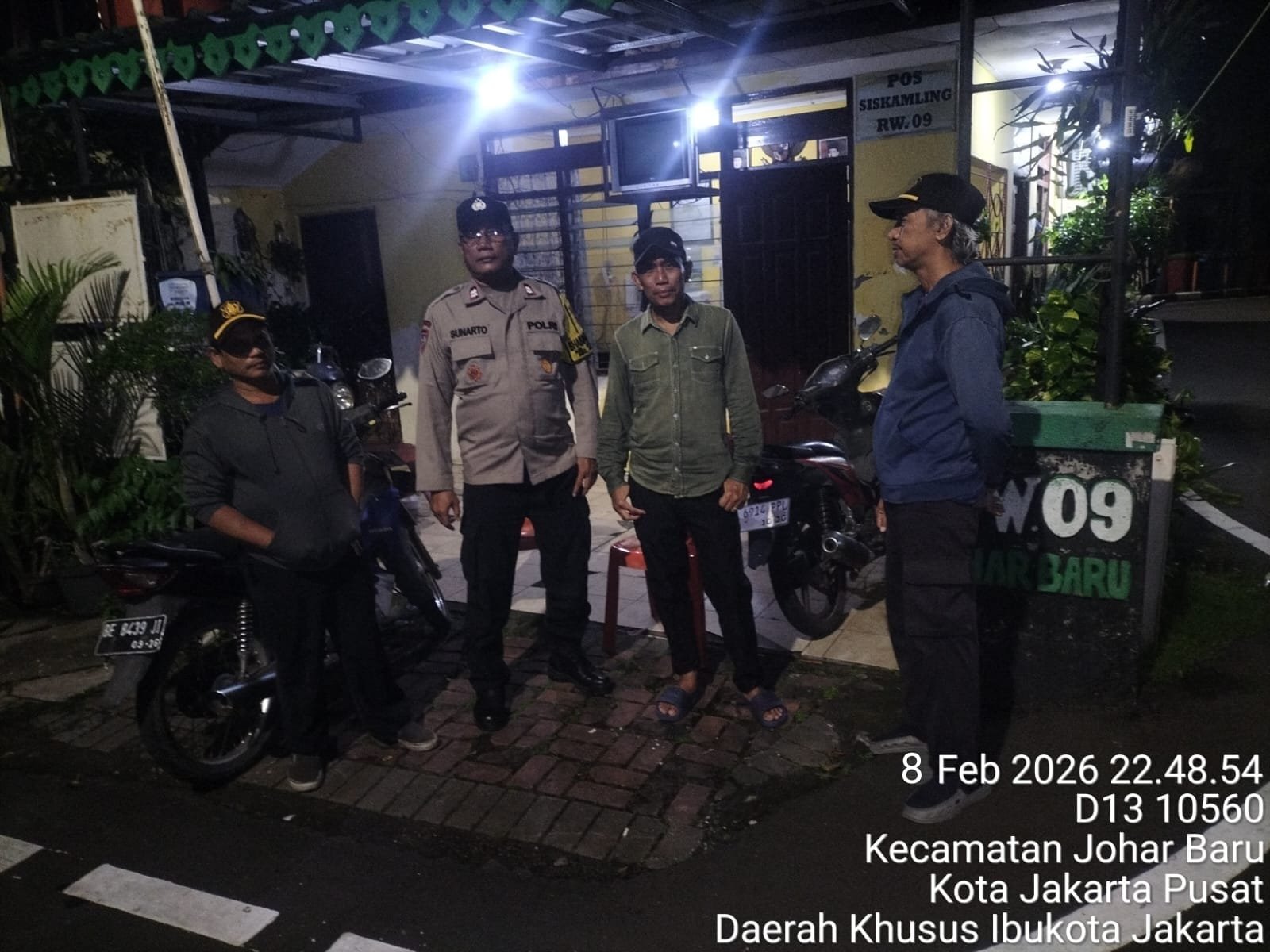 Jakarta Pusat – Guna menjaga situasi keamanan dan ketertiban masyarakat pada jam rawan malam hari, jajaran Polsek Johar Baru melalui Bhabinkamtibmas Kelurahan Johar Baru melaksanakan sambang Pos Keamanan Lingkungan (Pos Kamling) RW 09, pada Minggu (8/2/2026) sekitar pukul 00.30 WIB. Kegiatan berlangsung di Jalan Johar Natu, RW 09, Kelurahan Johar Baru, Kecamatan Johar Baru, Jakarta Pusat.