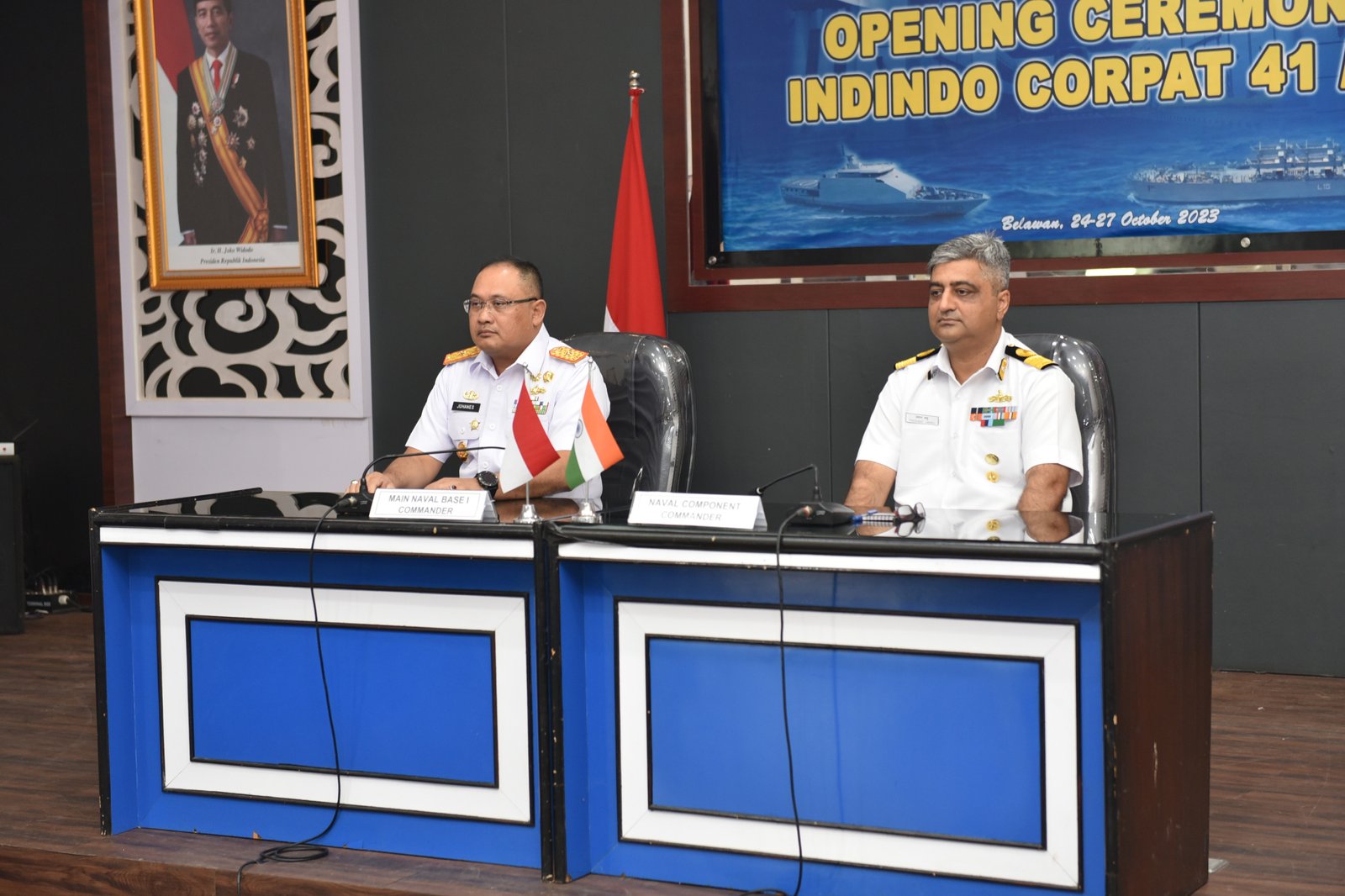 TNI AL, Belawan,- Komandan Pangkalan Utama TNI Angkatan Laut (Danlantamal) I Laksamana Pertama TNI Johanes Djanarko Wibowo memimpin pembukaan Patroli Terkoordinasi Indonesia dan India (Patkor Indindo) Ke- 41 Tahun 2023 secara resmi dibuka oleh Komandan Lantamal I didampingi Commodore Prashant Handu yang menjabat Naval Component Commander Of Cincan, bertempat di Gedung Yos Sudarso Mako Lantamal I, Jalan Serma Hanafiah No. 01, Belawan, Sumatera Utara, Rabu (25/10/2023).