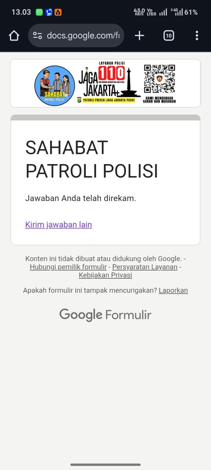 “Sekarang warga tidak perlu repot-repot datang ke kantor polisi bila ingin melaporkan sesuatu yang mendesak. Cukup pindai barcode yang tersedia, lalu sampaikan informasinya. Laporan tersebut langsung diterima oleh petugas kami,” ujar Susatyo kembali.