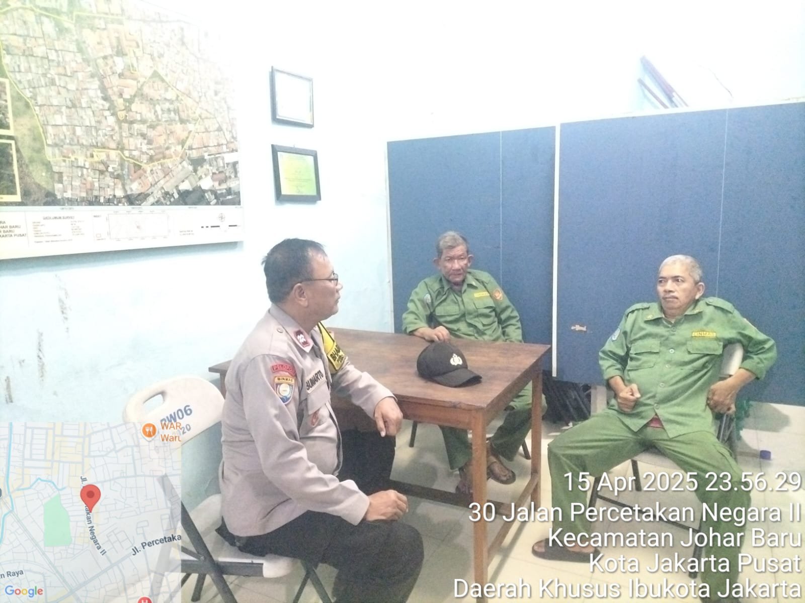 refubliknews.com, || Jakarta Pusat – Pada Selasa malam, 15 April 2025, pukul 23.30 WIB, Aiptu Sunarto, Bhabinkamtibmas Kelurahan Johar Baru, melaksanakan patroli sambang dan cooling system di Poskamling RW 06, Jalan Percetakan Negara II, RW 06, Kelurahan Johar Baru, Jakarta Pusat. Dalam kegiatan ini, Aiptu Sunarto bertemu dengan Bapak Dwid dan Bapak Frengky, yang merupakan awak poskamling setempat.
