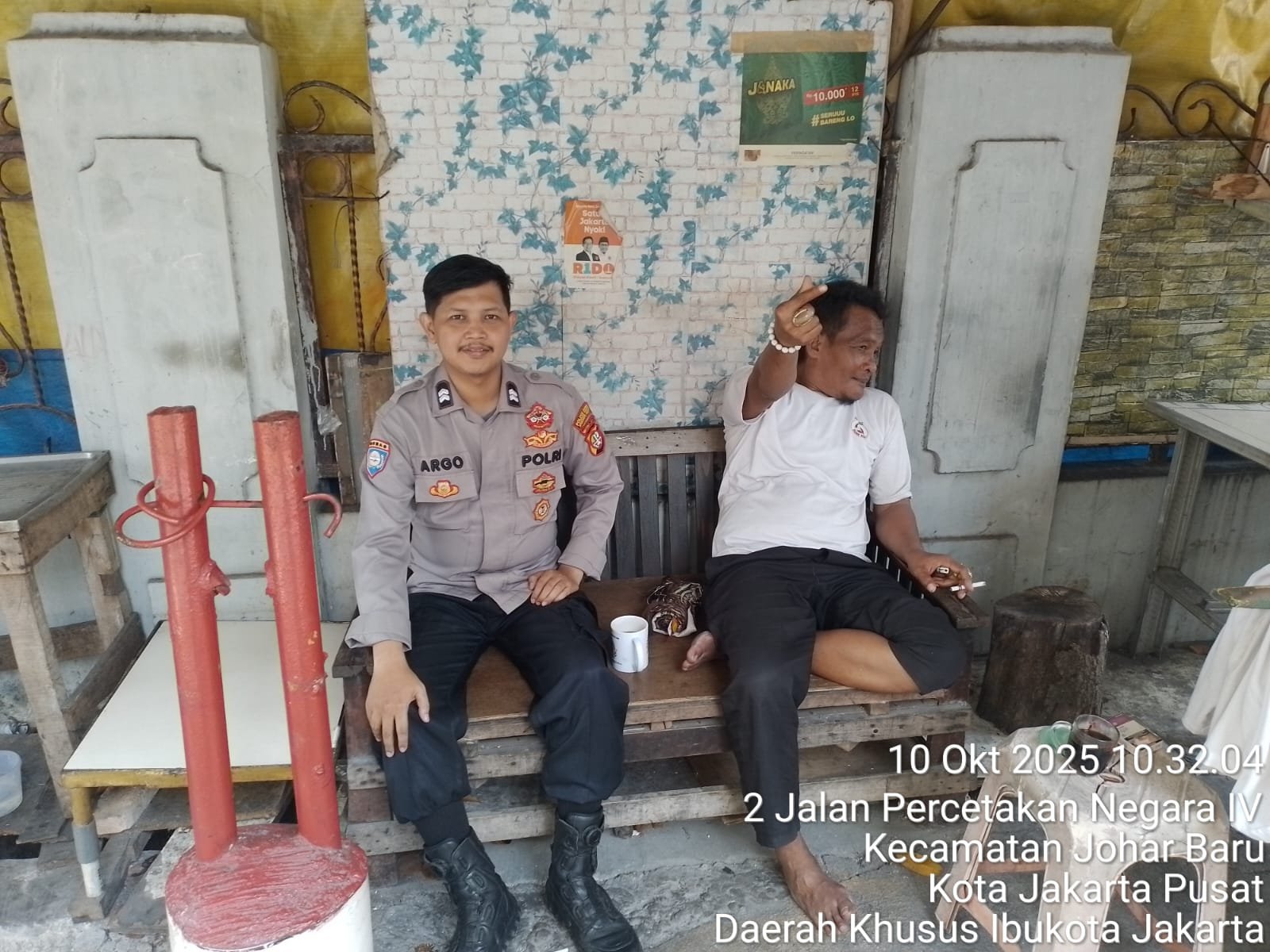 refubliknews.com, || Jakarta Pusat – Dalam rangka menjaga situasi kamtibmas tetap aman dan kondusif, anggota Polsubsektor Kayu Awet, Briptu Argo Ryantama Putra, melaksanakan patroli dialogis dan sambang warga di wilayah RW 09, Jalan Percetakan Negara IV, Kelurahan Johar Baru, pada Jumat (10/10/2025) pukul 10.00 WIB.