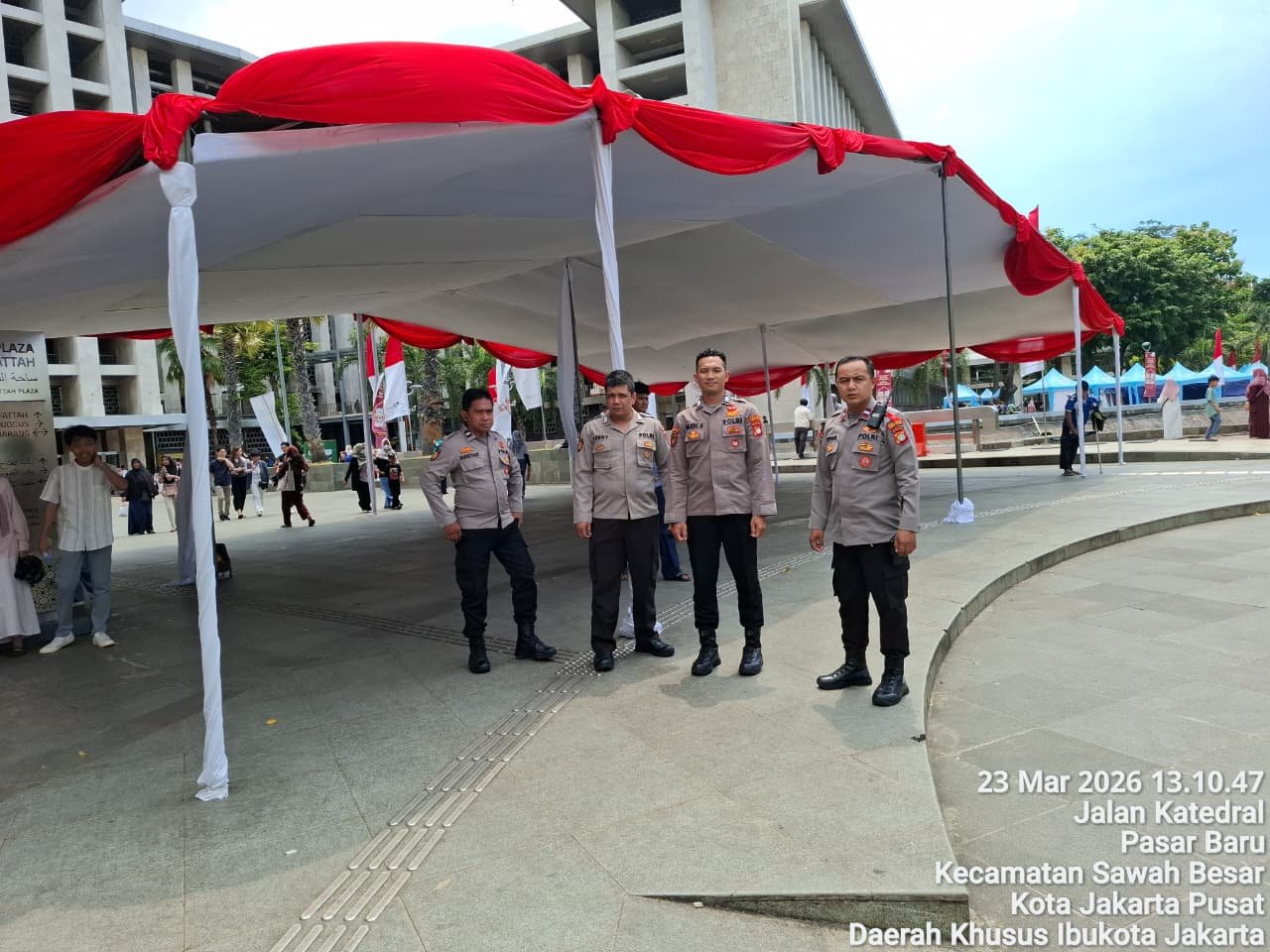 Jakarta Pusat – Personel Polsek Sawah Besar yang tergabung dalam Pos Pengamanan (Pospam) Masjid Istiqlal melaksanakan patroli jalan kaki pada Rabu (25/3/2026) pukul 13.00 WIB di kawasan Masjid Istiqlal, Sawah Besar, Jakarta Pusat. Kegiatan ini dipimpin langsung oleh Panit Samapta Aipda Ali Topan bersama tiga personel lainnya guna memastikan situasi keamanan dan ketertiban masyarakat tetap aman dan kondusif usai pelaksanaan salat dzuhur.