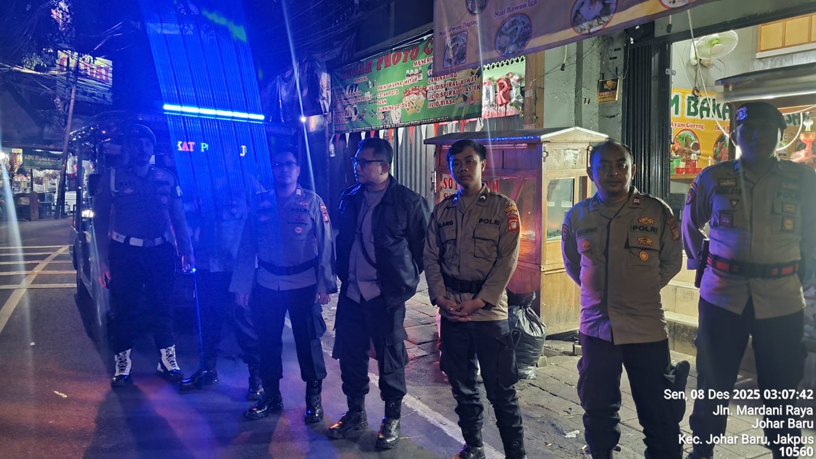 refubliknews.com, || Jakarta Pusat — Polsek Johar Baru melaksanakan Patroli Cipta Kondisi Antisipasi Guantibmas untuk menjaga keamanan wilayah. Patroli dipimpin Aiptu Lukas Indrijanto dari Kapolsubsektor Kayu Awet dengan kekuatan 10 personel. Senin, 8 Desember 2025, pukul 02.15 WIB.