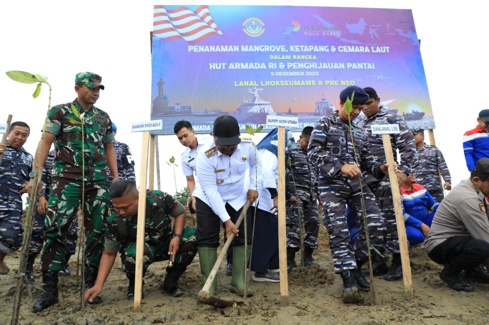 Komandan Lanal Lhokseumawe Kolonel Laut (P) Andi Susanto menyampaikan bahwa pihaknya bersama Forkopimda Aceh Utara dan PHE NSO melaksanakan kegiatan peduli lingkungan, diantaranya penanaman bibit mangrove, ketapang, dan cemara laut, dengan target 10 ribu pohon di Kawasan Pesisir Pantai Seunuddon, Kabupaten Aceh Utara.
