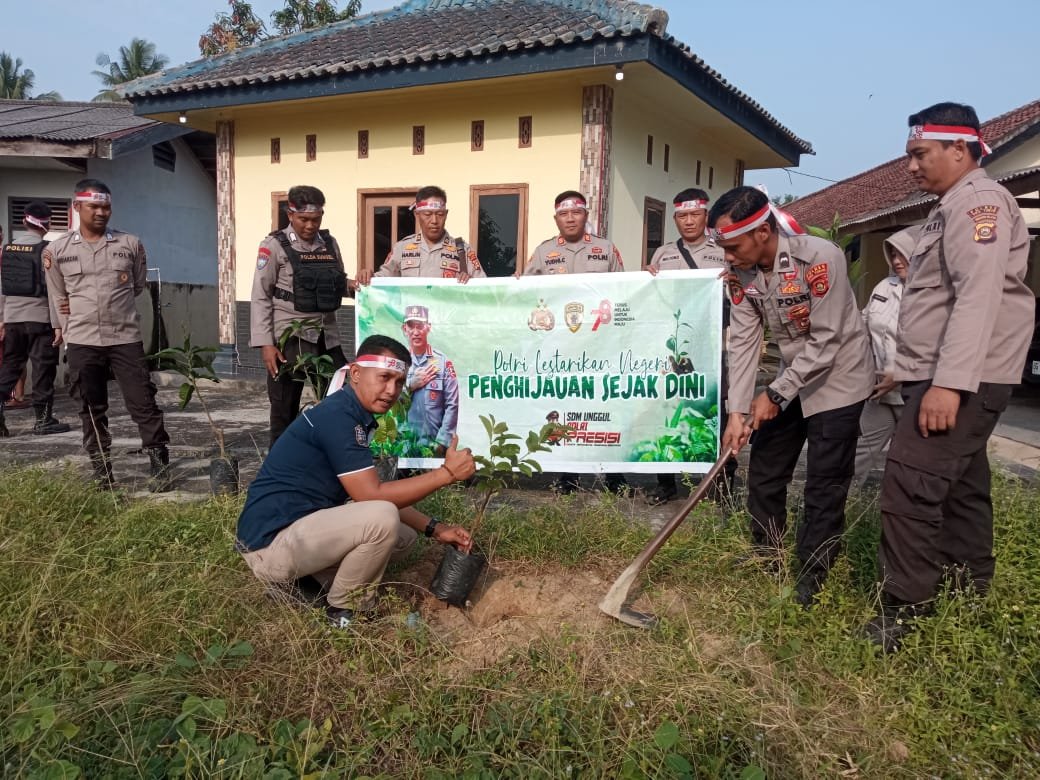 Kapolsek Buay Madang Polres Oku Timur Polda Sumsel, Akp Yudhi Cahyono bersama Personil Polsek melaksanakan giat penanaman pohon kembali di lingkungan Mako Polsek dan di kantor Kecamatan Buay Madang sebanyak 150 pohon. Kegiatan ini disambut hangat oleh Camat Buay Madang, Adrian Helmi SKM.,MM saat pelaksanaan penanaman pohon dan kegiatan ini masih dalam nuansa memeriahkan HUT RI Ke-78 dengan tema “Polri Lestarikan Negeri, Penghijauan Sejak Dini”, Kamis (23-08-2023).