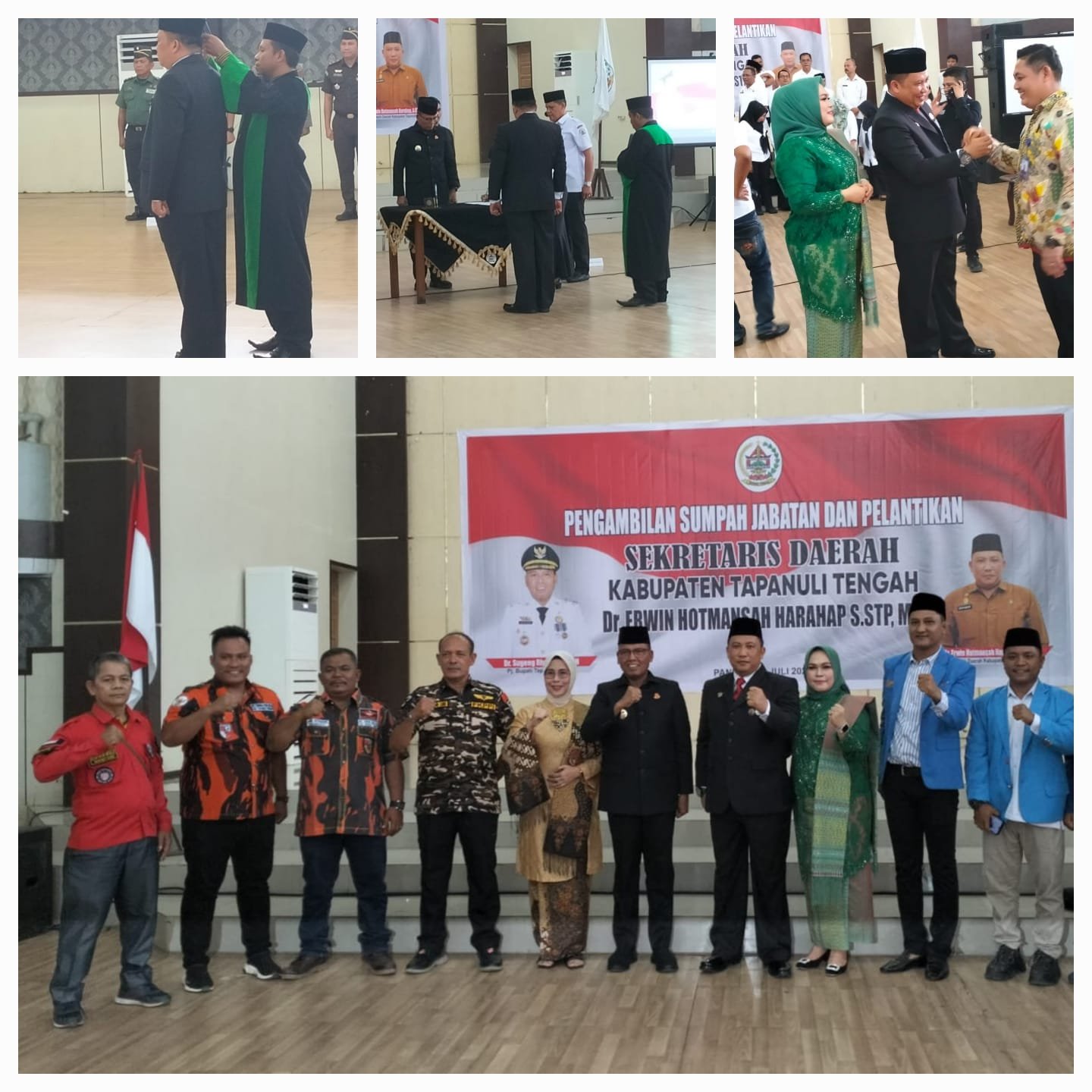 Tapanuli Tengah – Pengambilan sumpah jabatan dan pelantikan Sekretaris Daerah (Dr. Erwin Hotmansah Harahap, S.STP, MM) secara resmi dilantik oleh Pj. Bupati Kabupaten Tapanuli Tengah (Dr. Sugeng Riyatna, SH, MH) pada hari : Rabu, Tanggal 24 Juli 2024 di Gedung Serba Guna (GOR) Pandan yang dihadiri para pimpinan Forum Koordinasi Pimpinan Daerah (Forkopimda), Ketua Tim Penggerak PKK Kabupaten Tapanuli Tengah, Tokoh Masyarakat atau Ormas, para eselon dan ASN daerah Kabupaten Tapanuli Tengah.