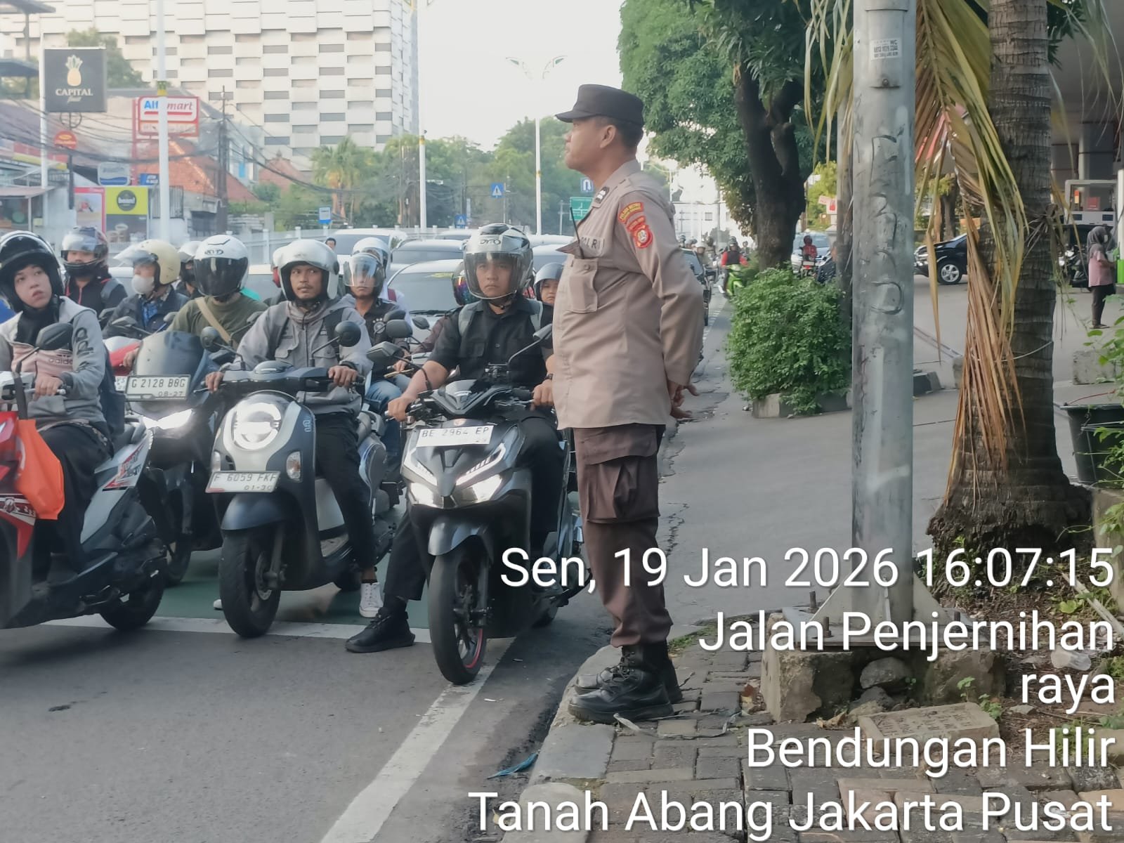 Jakarta Pusat — Untuk menjaga stabilitas keamanan dan kelancaran arus lalu lintas pada jam sibuk sore hari, Patko 1053 Polsek Metro Tanah Abang bersama piket Provost melaksanakan kegiatan strong point / police hazard di kawasan Penjernihan, Kelurahan Bendungan Hilir, Kecamatan Tanah Abang, Jakarta Pusat. Kegiatan ini berlangsung pada Senin, 19 Januari 2026, sore hari, dengan titik lokasi di Traffic Light (TL) Penjernihan.