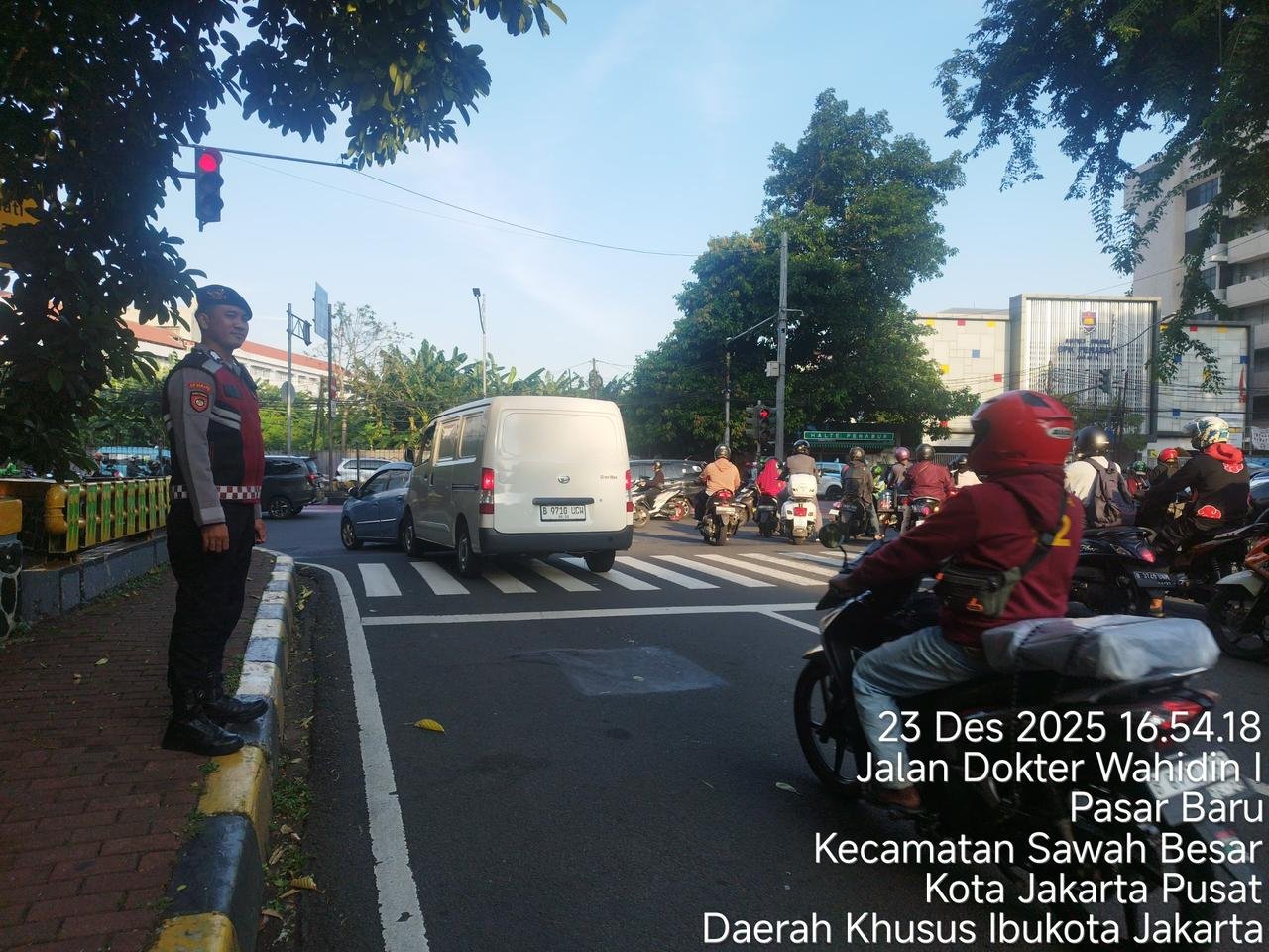 selasa sore (23/12/2025). Kegiatan ini dilaksanakan sejak pukul 16.00 hingga selesai sebagai upaya pencegahan kecelakaan lalu lintas sekaligus memastikan kelancaran mobilitas warga pengguna jalan yang pulang kerja, Pelayanan dan pencegahan tersebut dipimpin oleh Kanit Patroli Polsek Sawah Besar, Iptu Syafrizal, bersama Aiptu Anwarudin, dan 5 personil lainya di bantu oleh 6 personil Satlantas Polda Metro Jaya.
