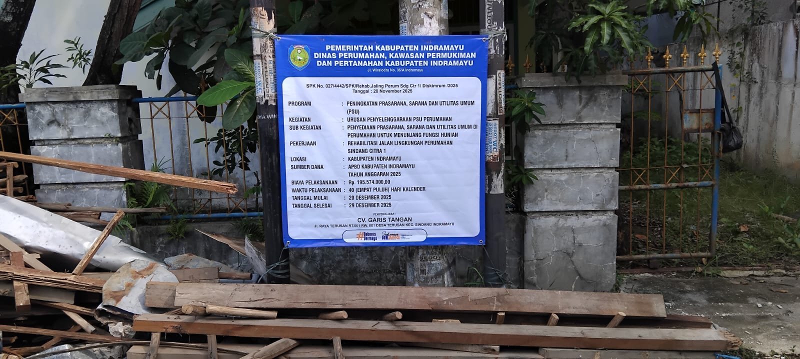 Rehabilitasi Cor Beton jalan lingkungan ini dengan biaya Rp 195.574.000,- dari Sumber Dana Anggaran Pendapatan Belanja Daerah (APBD) Kabupaten Indramayu Tahun Anggaran 2025 dengan waktu 40 hari kalender dari mulai 20 November 2025 sampai dengan 29 Desember 2025, Dengan penyedia jasa atau kontraktornya CV Garis Tangan Jalan Raya Terusan Rt 01 Rw 01 Desa Terusan Kecamatan Sindang Kabupaten Indramayu.