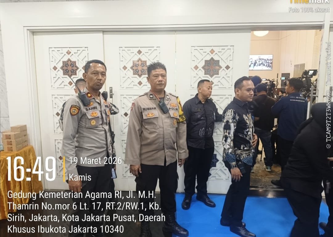 Jakarta Pusat – Polsek Metro Menteng melaksanakan kegiatan pelayanan pengamanan Sidang Isbat penetapan 1 Syawal 1447 Hijriah yang diselenggarakan oleh Direktorat Jenderal Bimbingan Masyarakat Islam Kementerian Agama RI. Kegiatan berlangsung di Auditorium H.M. Rasjidi, Kementerian Haji dan Umrah RI, Jalan MH Thamrin No. 6, Menteng, Jakarta Pusat, dengan situasi aman, tertib, dan kondusif. Kamis (19/3/2026)