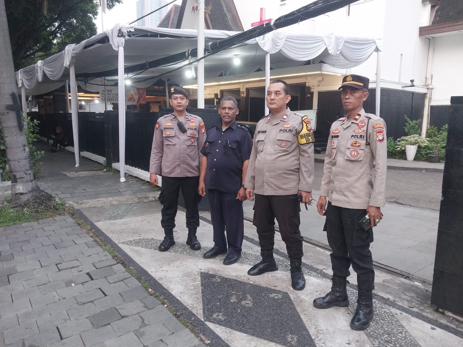 Untuk memastikan keamanan dan kenyamanan seluruh rangkaian ibadah, jajaran kepolisian dari Polres Metro Jakarta Pusat bersama personel gabungan dikerahkan dalam giat pengamanan yang dipimpin oleh Perwira Pengendali (Padal), Iptu Agung Sukiswo. Sejak pagi hari, petugas keamanan telah bersiaga di lokasi, melakukan penyisiran area gereja dan sekitarnya, serta melakukan sterilisasi demi mengantisipasi potensi gangguan keamanan.